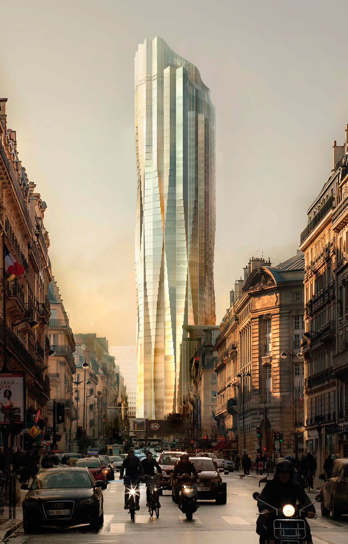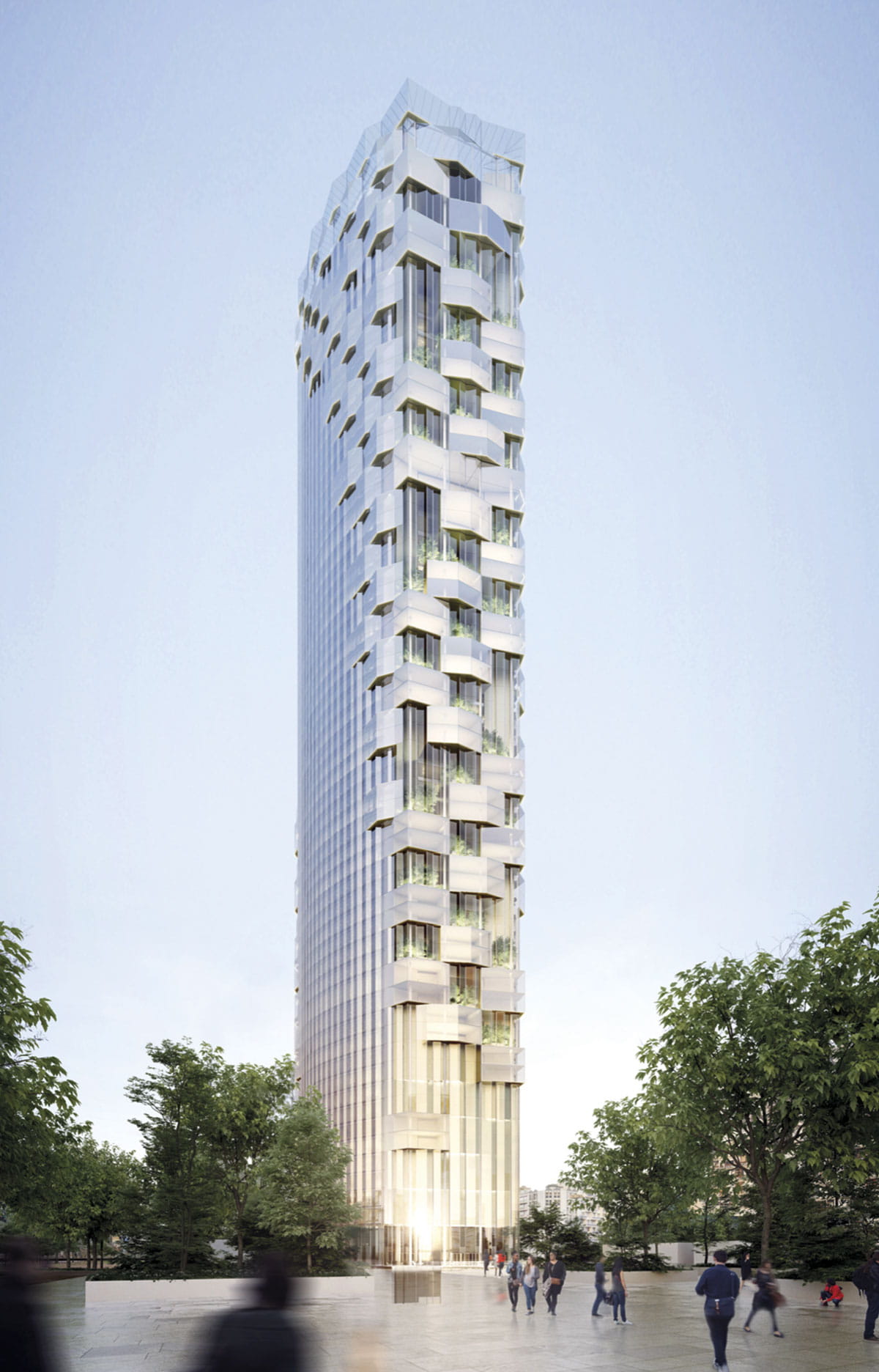 Avec son Aqua Tower bleutée à Chicago, Jeanne Gang a réussi le pari de s’imposer dans la ville emblématique des gratte-ciel. Faire table rase du passé : c’est l’attitude qui a guidé la proposition de l’Américaine. Elle présentait donc une architecture générique, peu parisienne, qui aurait pu se trouver ici ou ailleurs… La métamorphose s’opérait par une façade facettée offrant à chaque étage des points de vue différenciés sur la ville. Malgré le théâtre de verdure perché, un jardin surélevé en pied de tour ou un observatoire panoramique comme dans la plupart des projets, la « monumentalité généreuse » défendue par Studio Gang n’a finalement pas convaincu assez pour atteindre la première place du podium.
