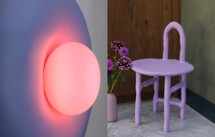 Et quand il ne s’amuse pas avec les formes, c’est avec les couleurs, vives sans pour autant être agressives, qu’il joue. La preuve avec le luminaire « Calley Scone », qui offre un élégant dégradé bleu et violet, ou encore avec sa lampe à poser et ce miroir en triptyque rouge et mauve. « J’ai toujours l’impression qu’il est encore trop tôt pour définir le style de mon design, explique le Californien. Je considère mon travail comme une exploration de mes intérêts et je veux laisser le plus de place possible au changement. »