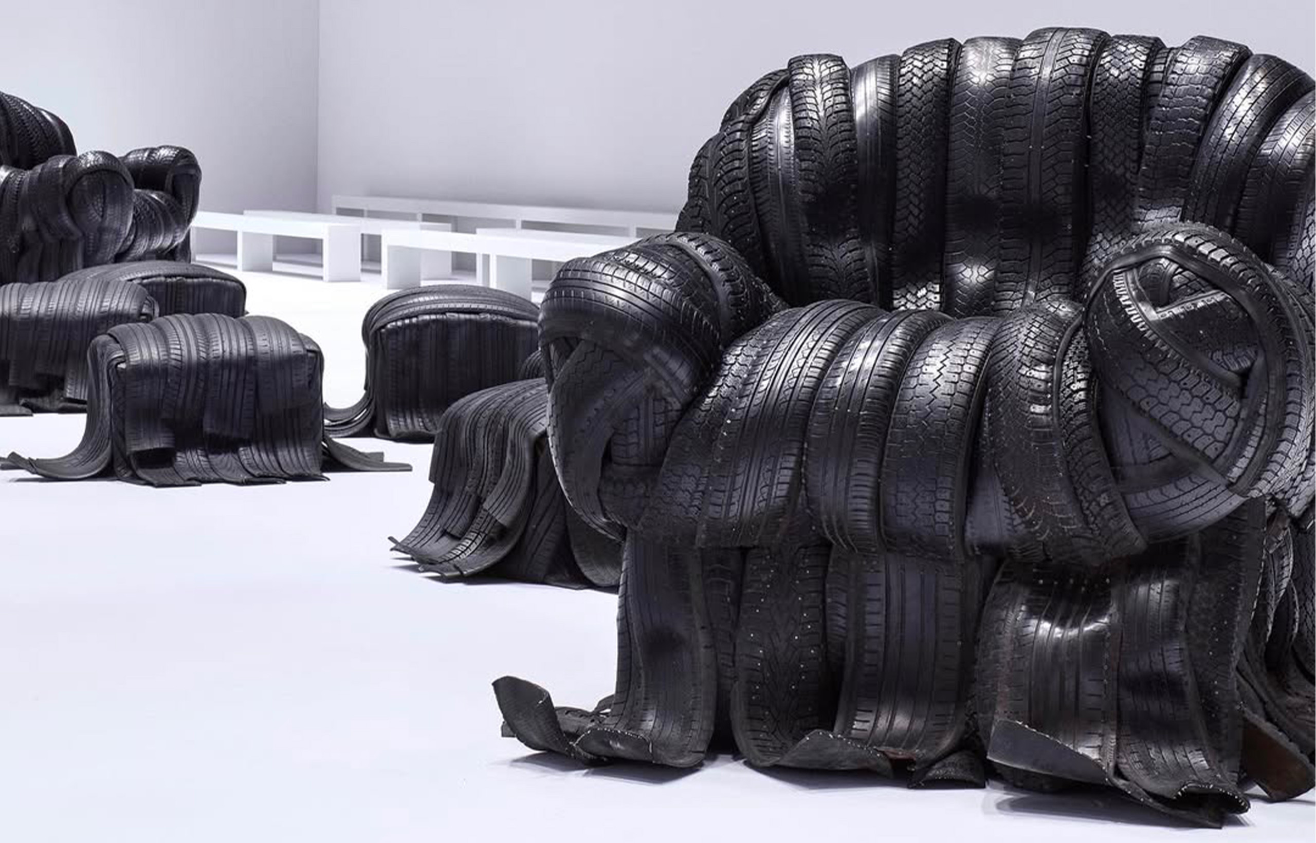 La mode aime se mélanger à l’art et au design. Pour son dernier défilé de mode, la marque scandinave Acné Studios a souhaité réunir ces univers grâce à l’intervention de l’estonien Villu Jaanisoo. Sobre et dépouillé, le décor immaculé s’est vu perturbé par ses œuvres monumentales réalisées en pneus recyclés. Reprenant les formes de pièces de mobilier en version démesurée, les créations dégoulinantes du sculpteur semblent venir d’un autre monde.