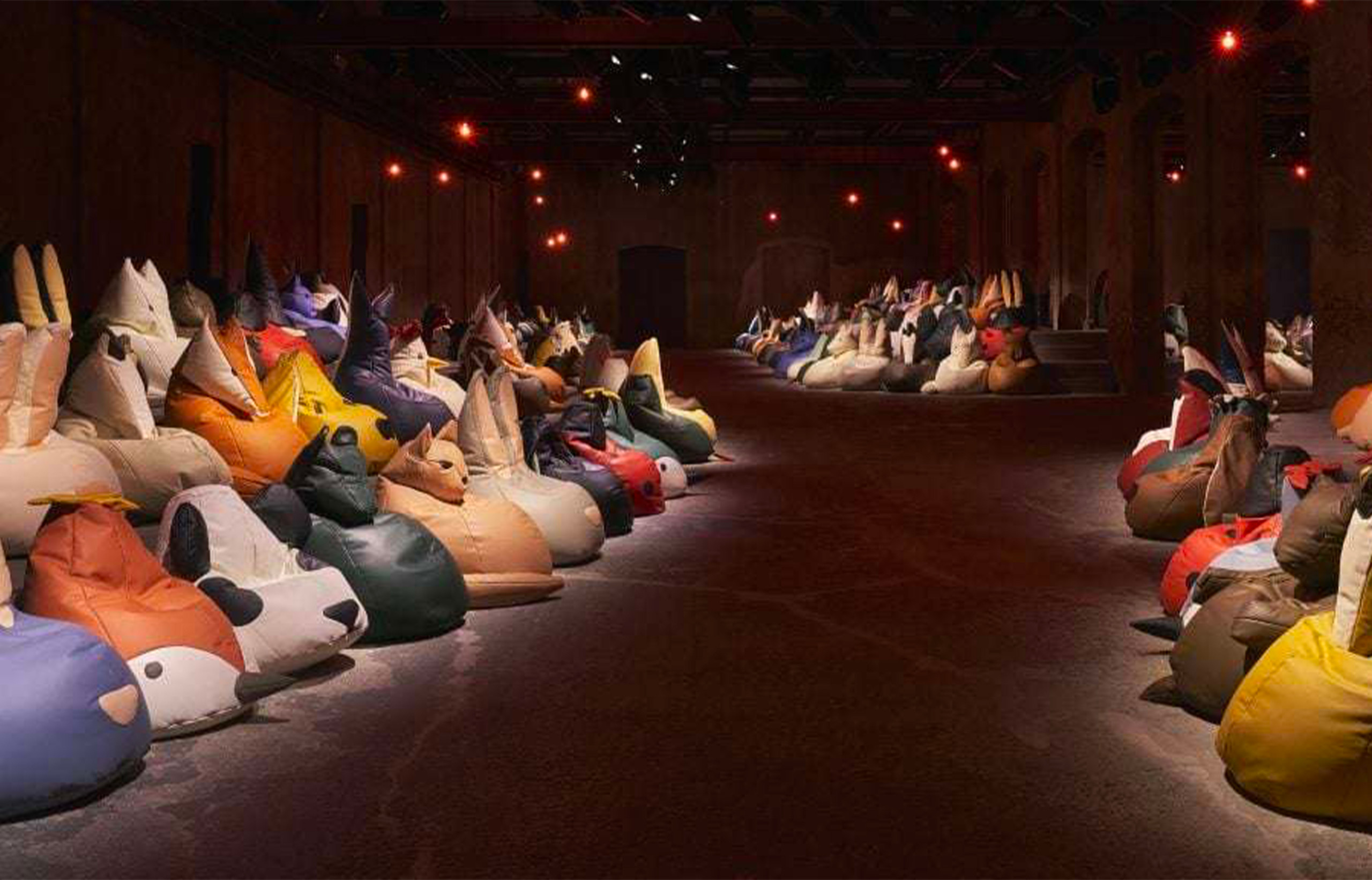 Après avoir mis sur un piédestal les tabourets Cabanon LC14 du Corbusier, Bottega Veneta quitte l’univers du design au profit d’un décor ludique fait d’une soixantaine de poufs poire à l’effigie d’animaux en tous genres, de la poule au lapin en passant par l’orque et le renard. Le nom donné par Matthieu Blazy, directeur artistique de la maison italienne, à la scénographie est on ne peut plus évocateur : l’Arche, en référence à l’Arche de Noé, évidemment, un navire construit, selon la Bible, afin de sauver toute la faune mondiale d’un Déluge menaçant.