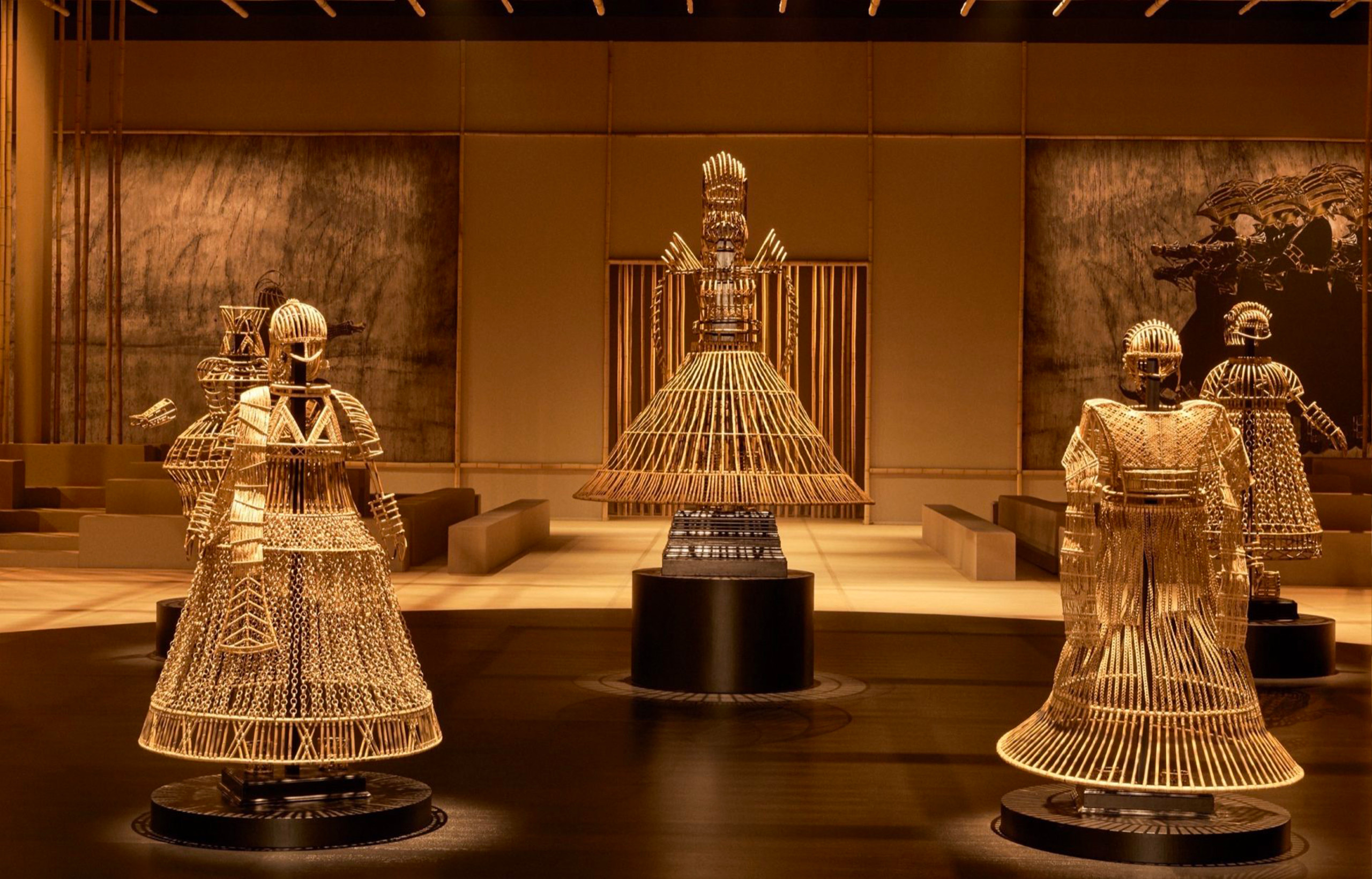 Pour présenter sa collection Automne-Hiver 2025, Maria Grazia Chiuri, à la tête des collections femme de la maison, a confié la réalisation du décor de son défilé de mode à l’artiste indienne Shakuntala Kulkarni. La scénographie s’articulait autour de la série d’œuvres de l’artiste intitulée of bodies, amour and cages, soit des armatures-armures de rotin qui protègent le corps, le transforment et même l’emprisonnent – non sans rappeler les corsets et autres vertugadins d’antan. La sculpteuse originaire de Mumbai tend à questionner le rapport du corps féminin à l’autre et à l’espace public. Un travail qui fait écho à l’univers de la mode et aux préoccupations féministes de la directrice artistique tout en plongeant les spectateurs dans une atmosphère fantomatique, les mannequins déambulant aux côtés de ces figures statiques.