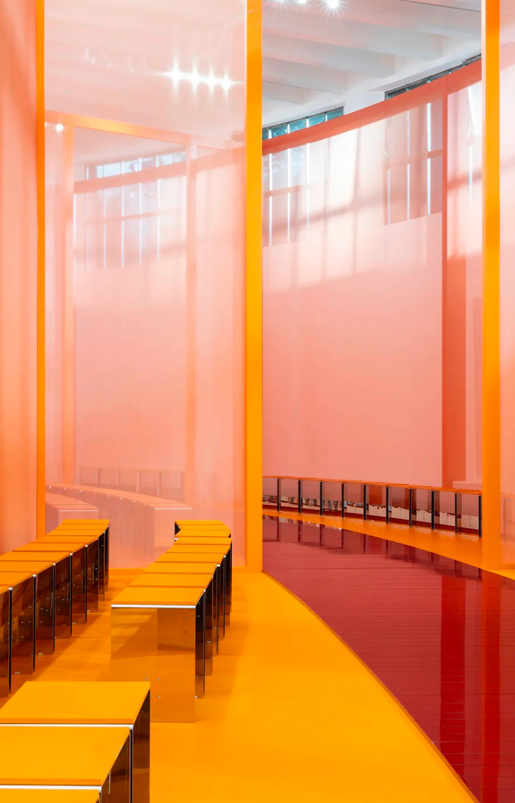 C’est dans le temple du design de la ville de Milan, le Triennale Milano Museum, que Gucci a choisi de présenter sa collection Printemps-Eté 2025 le 20 septembre dernier. Un lieu qui en lui-même promet un décor inoubliable. C’était sans compter l’inventivité de Sabato de Sarno, directeur artistique de la griffe, qui, à l’aide d’immenses panneaux translucides colorés, a redessiné l’immense rez-de-chaussée pour le transformer pour en un runway passant du jaune d’or au rouge vibrant façon coucher de soleil.