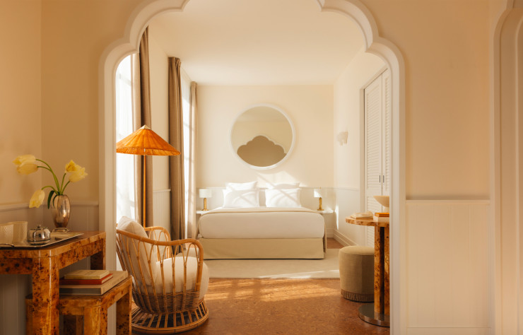 Le duo privilégie des teintes neutres, des camaïeux de beiges et des essences de bois clair que l’on retrouve d’ailleurs dans leur propre appartement parisien. « Nous expérimentons au quotidien des espaces relativement doux, qui évoluent en fonction de la lumière du jour et qui procurent une grande sensation de liberté. A contrario, si vous vous trouvez dans une pièce entièrement rouge, vous allez avoir une réaction. » Les deux designers rendent hommage à la magnifique luminosité qui baigne la cité, typique de la Côte d’Azur. « Une grande partie des chambres est orientée plein sud et est donc accompagnée par cette lumière changeante tout au long de la journée. Ces nuances donnent la part belle aux rayons du soleil, les laissant s’exprimer pleinement. »