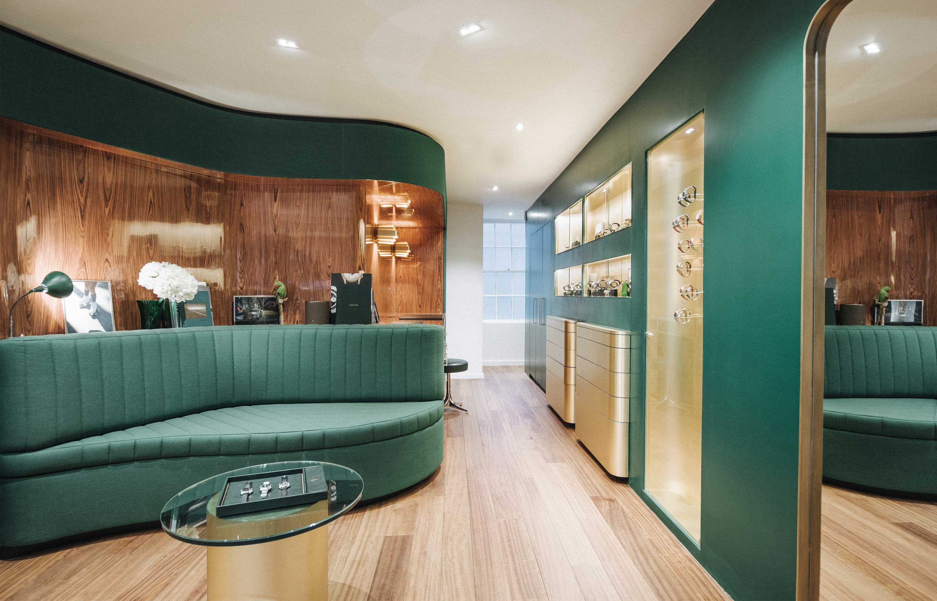 L’espace de 30 m2, niché au rez-de-chaussée d’un immeuble du XVIIIe siècle de Soho, est un écrin seventies tout en arrondis où se mêlent le vert d’un canapé recouvert de tissu Kvadrat surpiqué, le laiton doré des appliques et le bois de palissandre. Clin d’œil au surf – la passion d’Alain Marhic –, une planche rutilante attire le regard. Mais ce sont surtout les montres qui retiennent l’attention. Un design rétro habillé de finitions contemporaines, unisexe pour la plupart des références, des couleurs étudiées, dont une palette de verts que l’on retrouve notamment à l’arrière du boîtier et, en doublure, des bracelets de cuir : les modèles se font séduisants.