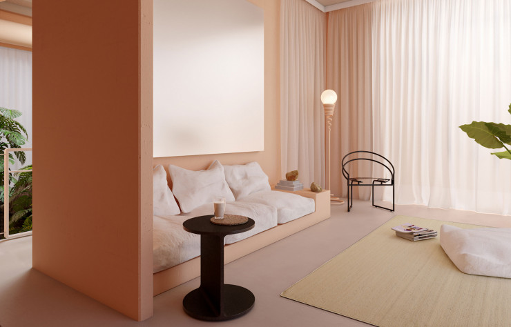 Au cœur de la maison se trouve un atrium composé de plantes et de rochers visibles de part et d’autre de l’habitation – d’où l’utilisation du mot enclave. « La nature n’est pas laissée à l’extérieur, mais intégrée au quotidien » ajoute Hannes Lippert. Au départ, le projet avait pour objectif de mettre en avant plusieurs productions design de l’artiste 3D – à savoir une lampe de bureau et un lampadaire – mais petit à petit l’idée de créer un lieu habitable a fait son chemin : « Après avoir déterminé l’architecture des premières pièces, je me suis mis à réfléchir à la manière dont je pourrais développer une maison entière dans lequel j’aimerais vivre».