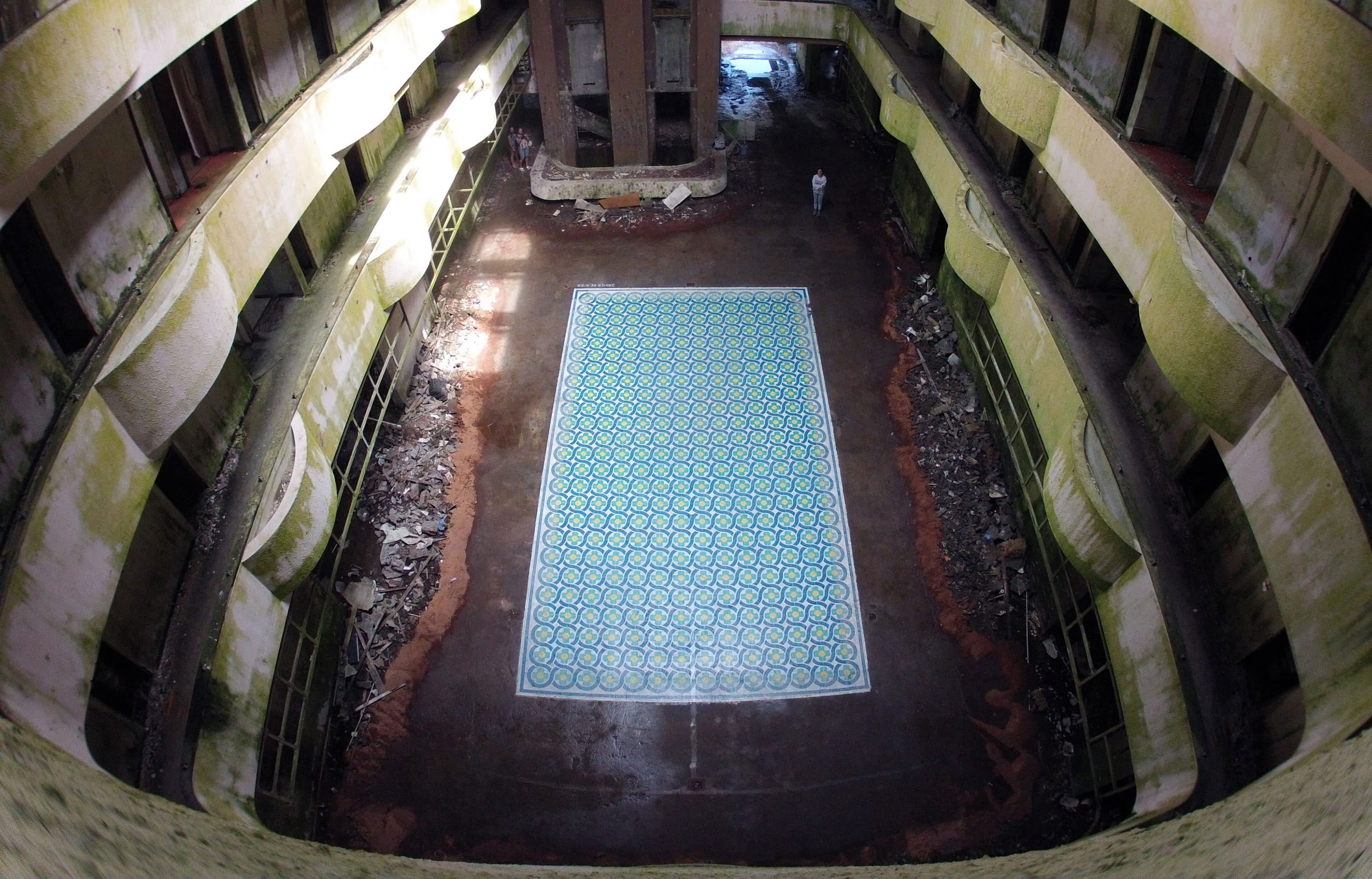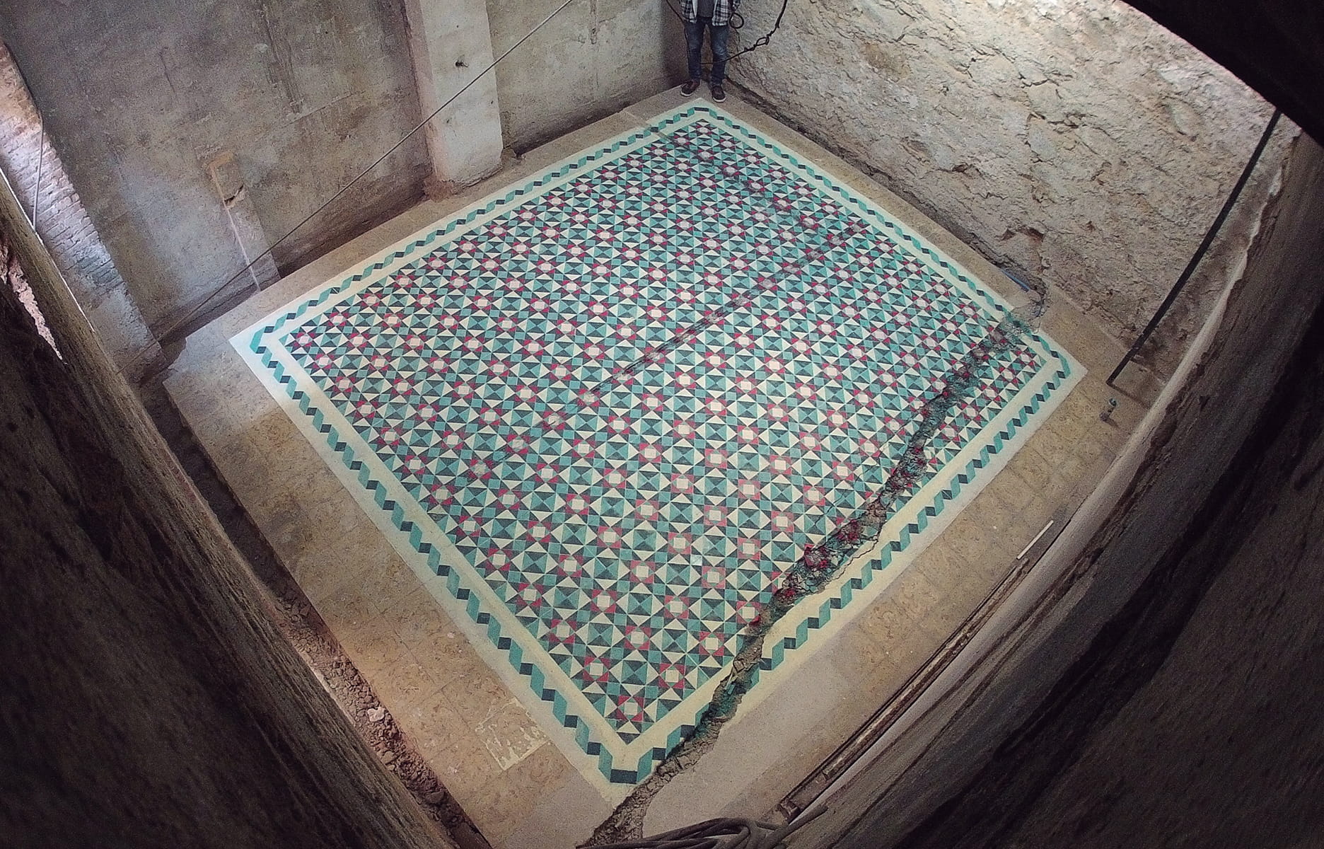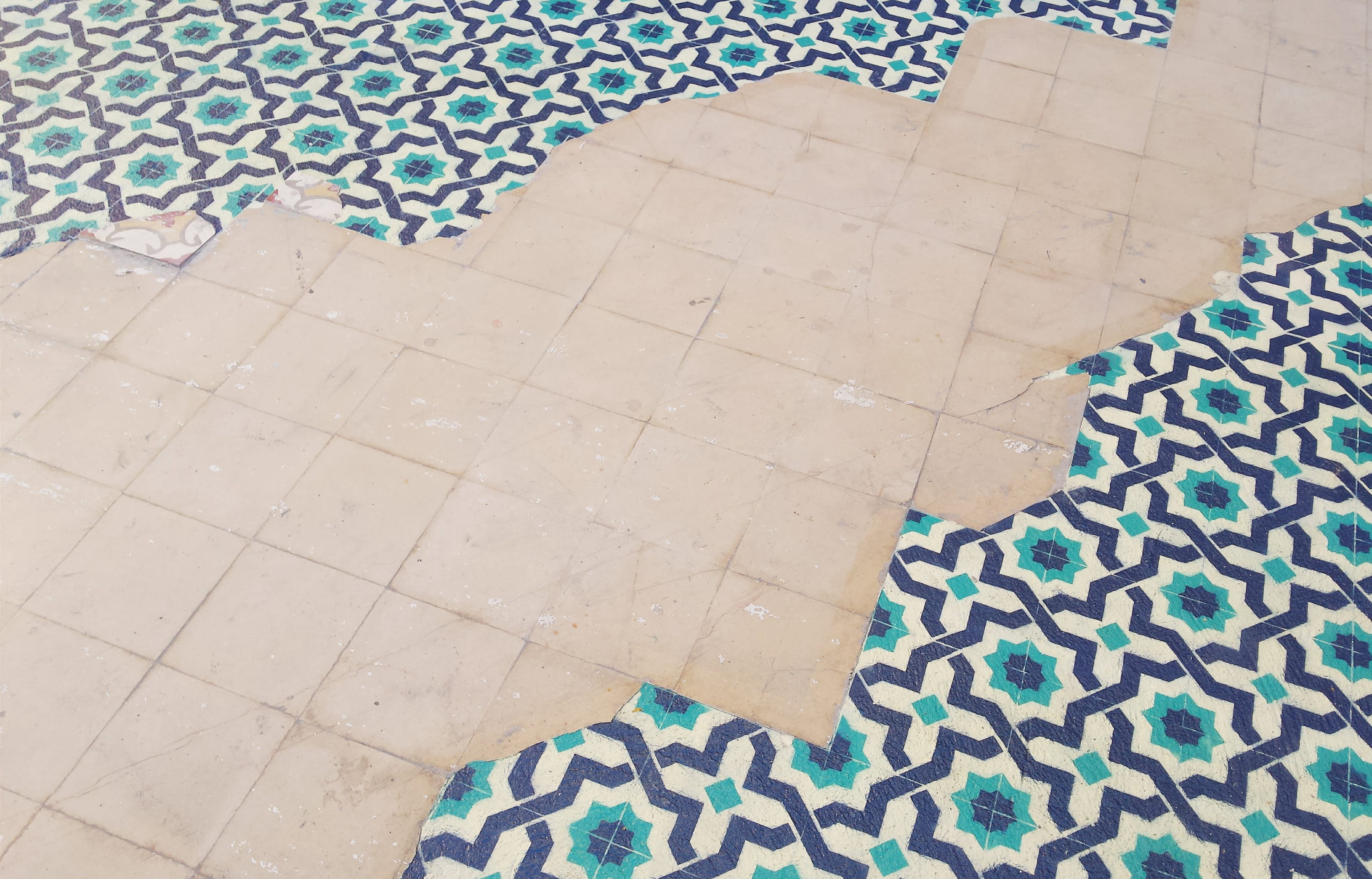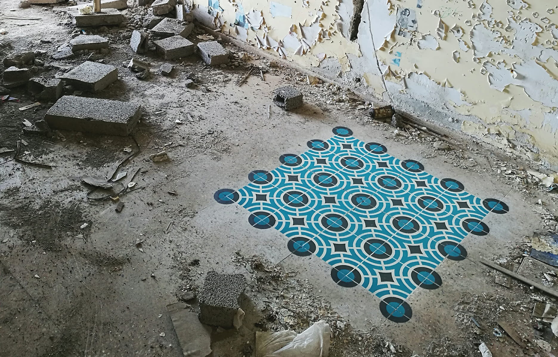 Après de longs repérages, Javier de Riba applique au pochoir, sur des sols grisâtres et uniformes, des motifs inspirés par les mosaïques de son enfance.