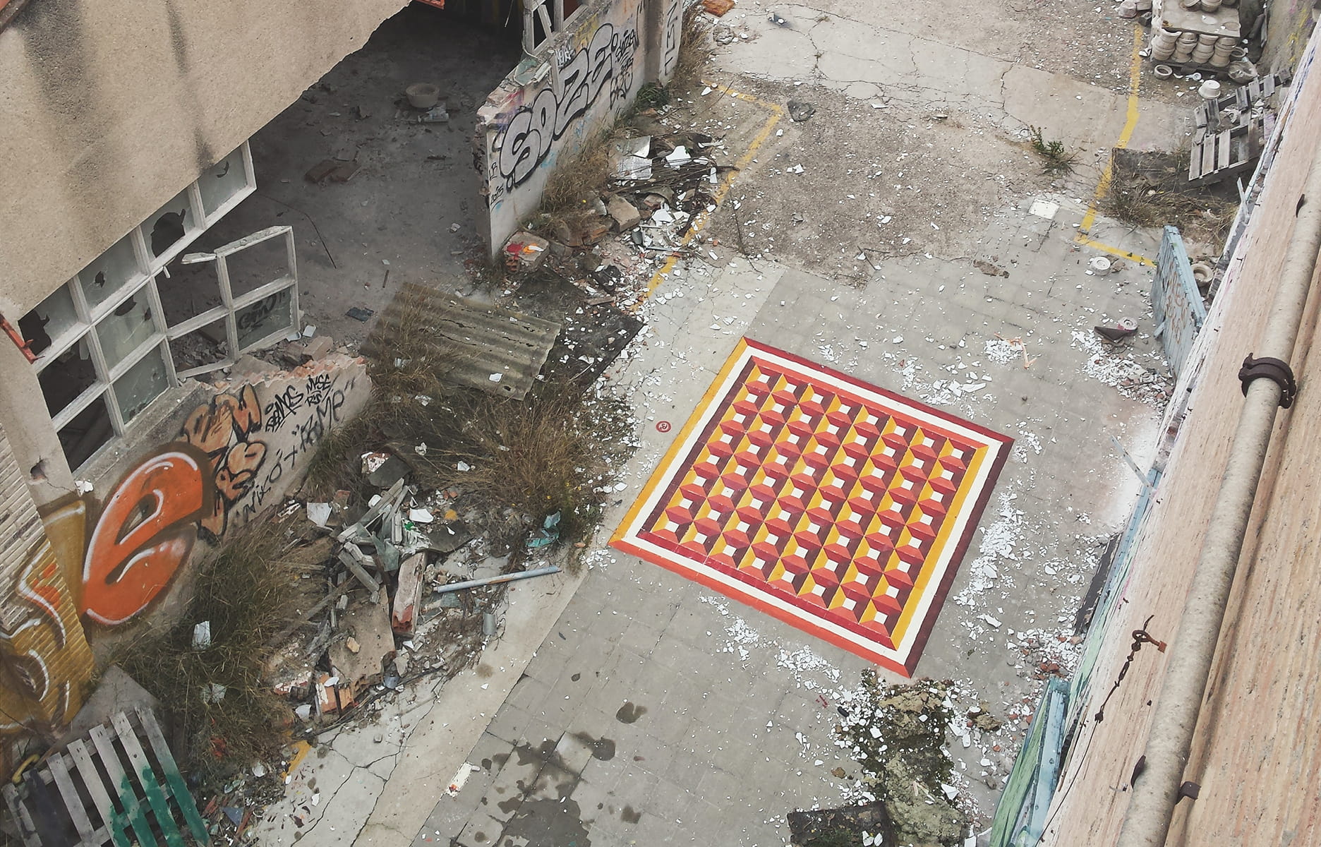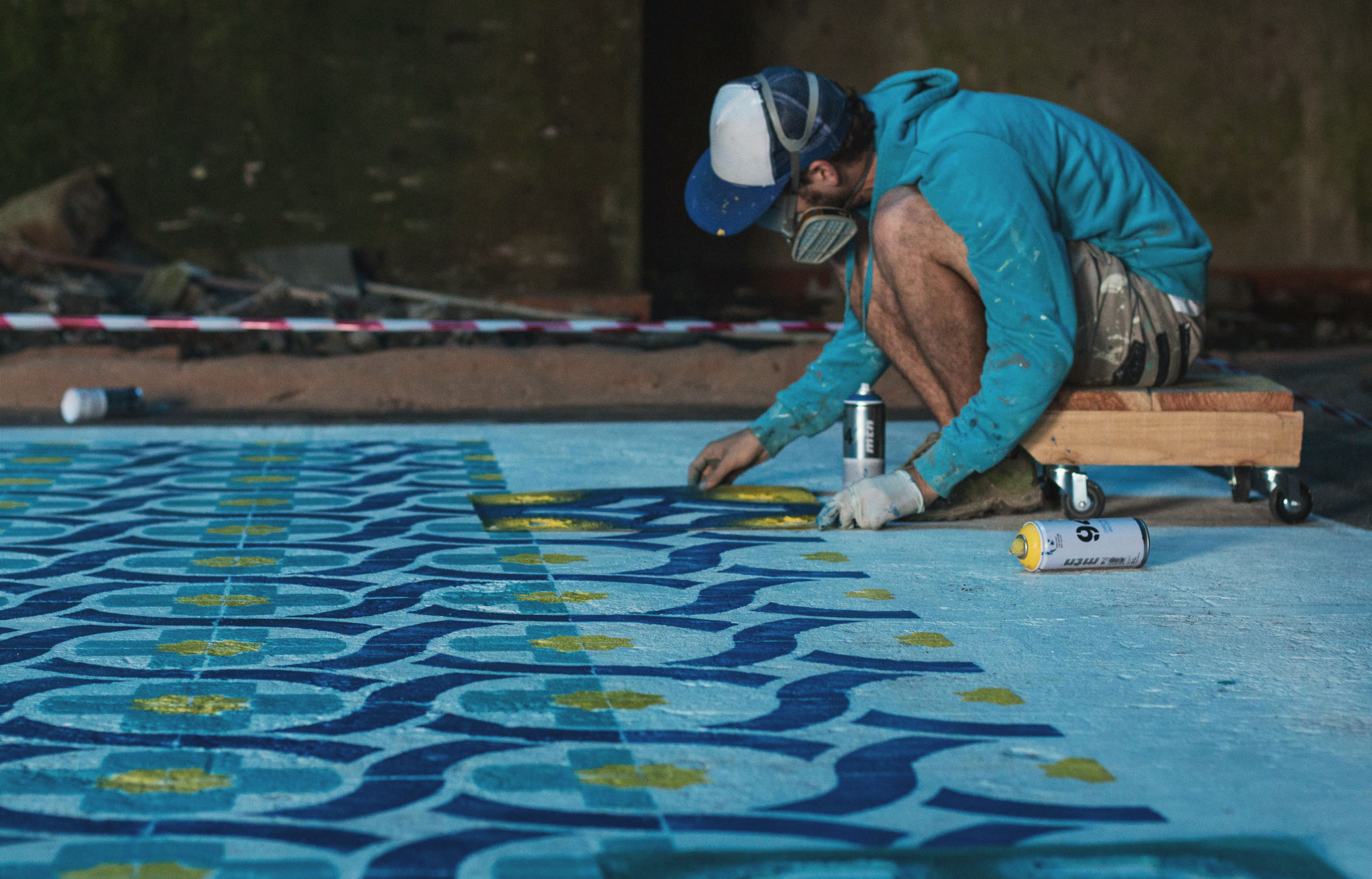Baptisé Floors, le projet est logiquement nommé en référence à l’utilisation des sols en tant que toiles mais aussi au terme catalan « flors » signifiant fleur. Car, comme l’artiste se plaît à le rappeler, là ou les sols sont délaissés, « des fleurs finissent généralement par apparaître ».