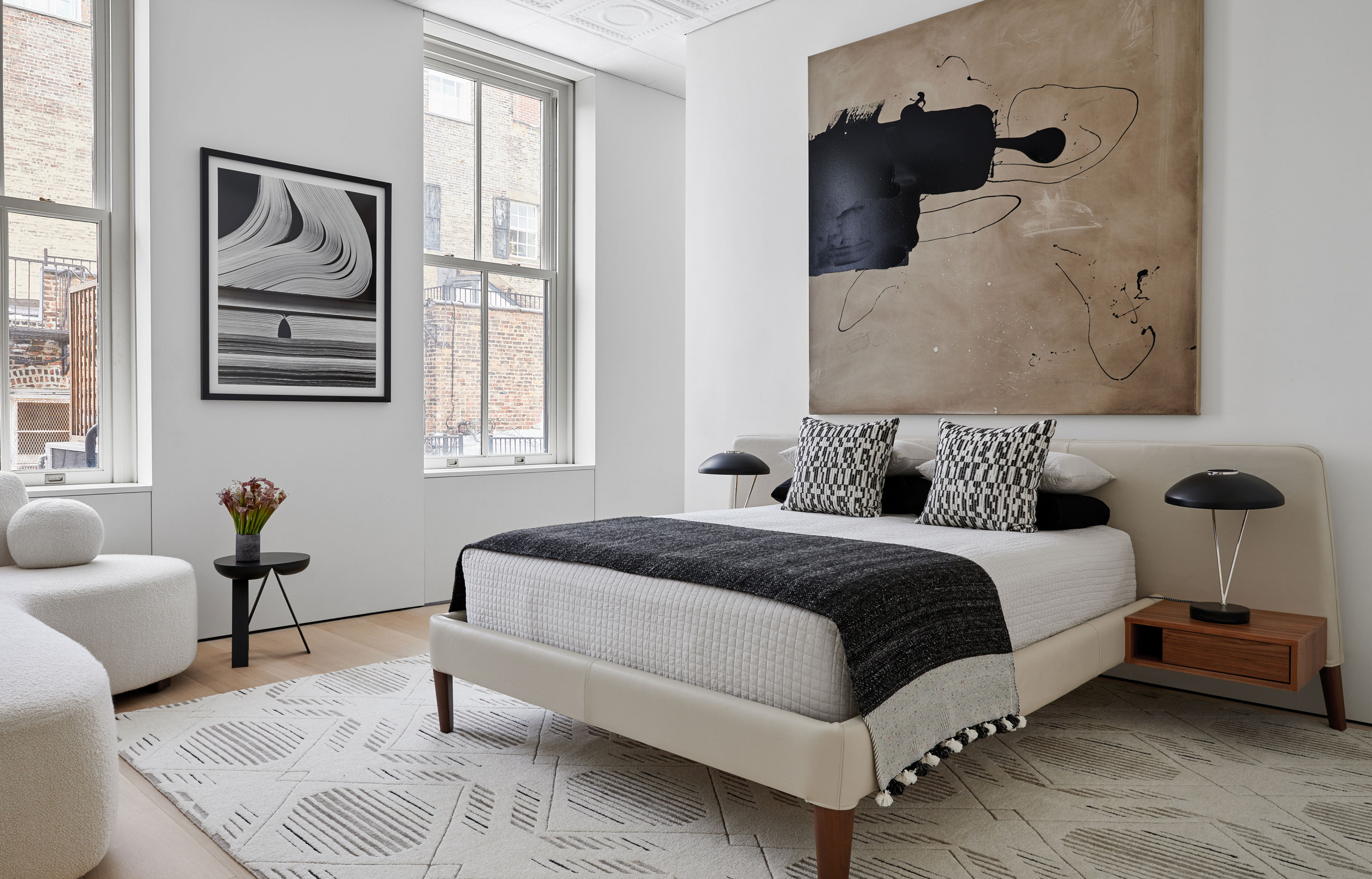 La décoration intérieure des six pièces composant le loft a été pensée par l’architecte d’intérieur, Justin Charette. Il lui aura fallu une année entière pour concevoir l’aménagement de l’habitation occupant tout un étage, soit 260 mètres carrés : «Nous voulions créer quelque chose de moderne et de paisible qui trouve son équilibre entre le cadre ancien du loft et la rénovation contemporaine. L’espace est une énorme source d’inspiration, tout comme les bâtiments environnants que l’on peut admirer à travers les fenêtres. Opter pour la sobriété permet une synergie élégante entre les caractéristiques architecturales et mes choix de design» ajoute Justin Charette. Cette garçonnière qui devait, à l’origine, être un simple pied-à-terre pour le propriétaire est devenue sa résidence principale en raison de la crise sanitaire. Ainsi, le loft devait permettre à quiconque de s’évader durant un instant. Apaisant et serein, cet espace intemporel se conjugue à merveille avec la vie new yorkaise.