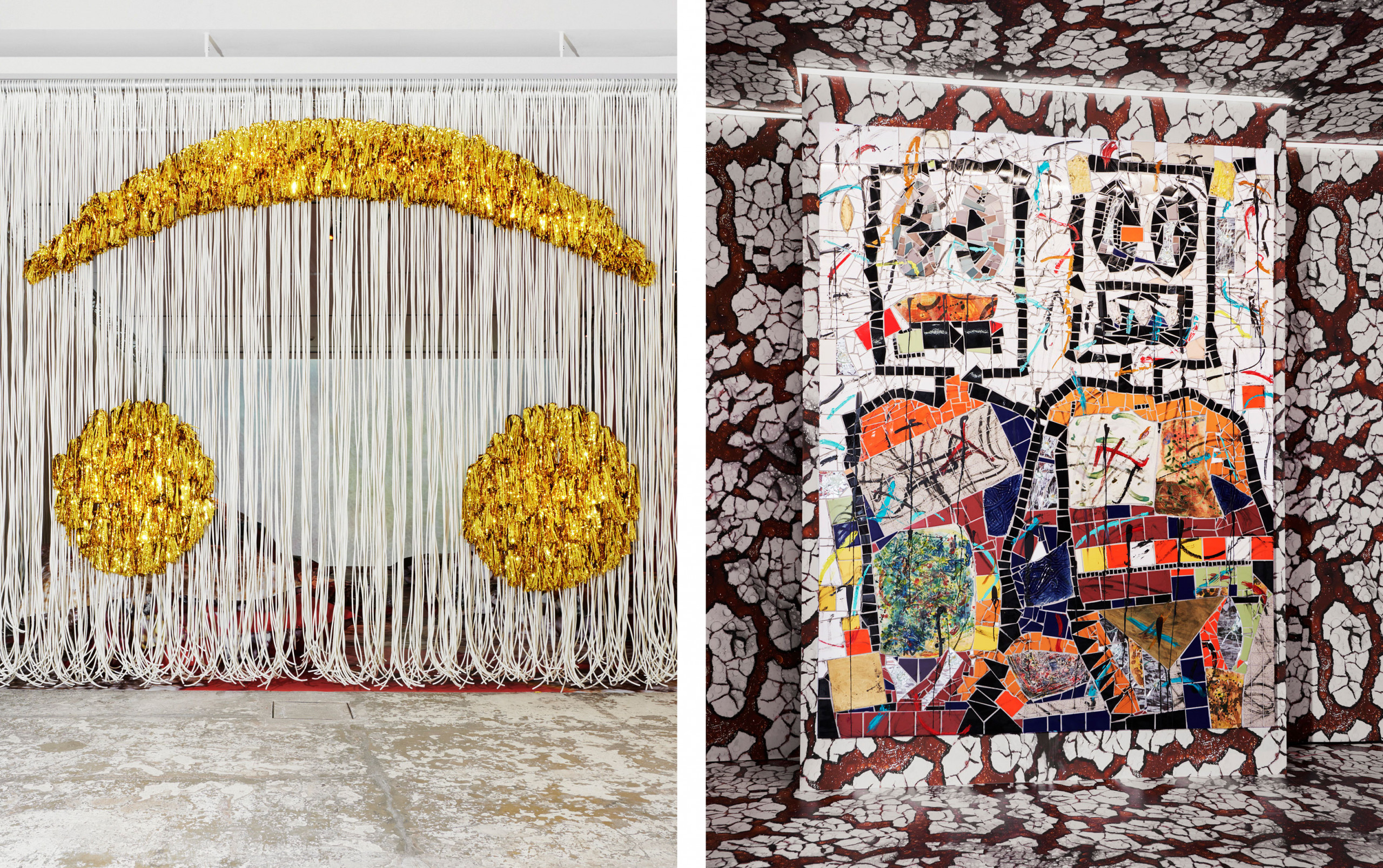 D’entrée, une grande toile de Rashid Johnson est présentée sertie dans l’univers graphique de Kenny Duncan qui a intégralement peint les murs autour. Ce mentorat suggère le dialogue de deux esprits, échangeant avec d’autant plus d’intérêt qu’ils viennent d’horizons culturels différents mais peuvent traiter dans leurs œuvres des sujets proches. On pense spontanément à l’identité et l’influence que peut avoir sur elle la perception d’autrui.