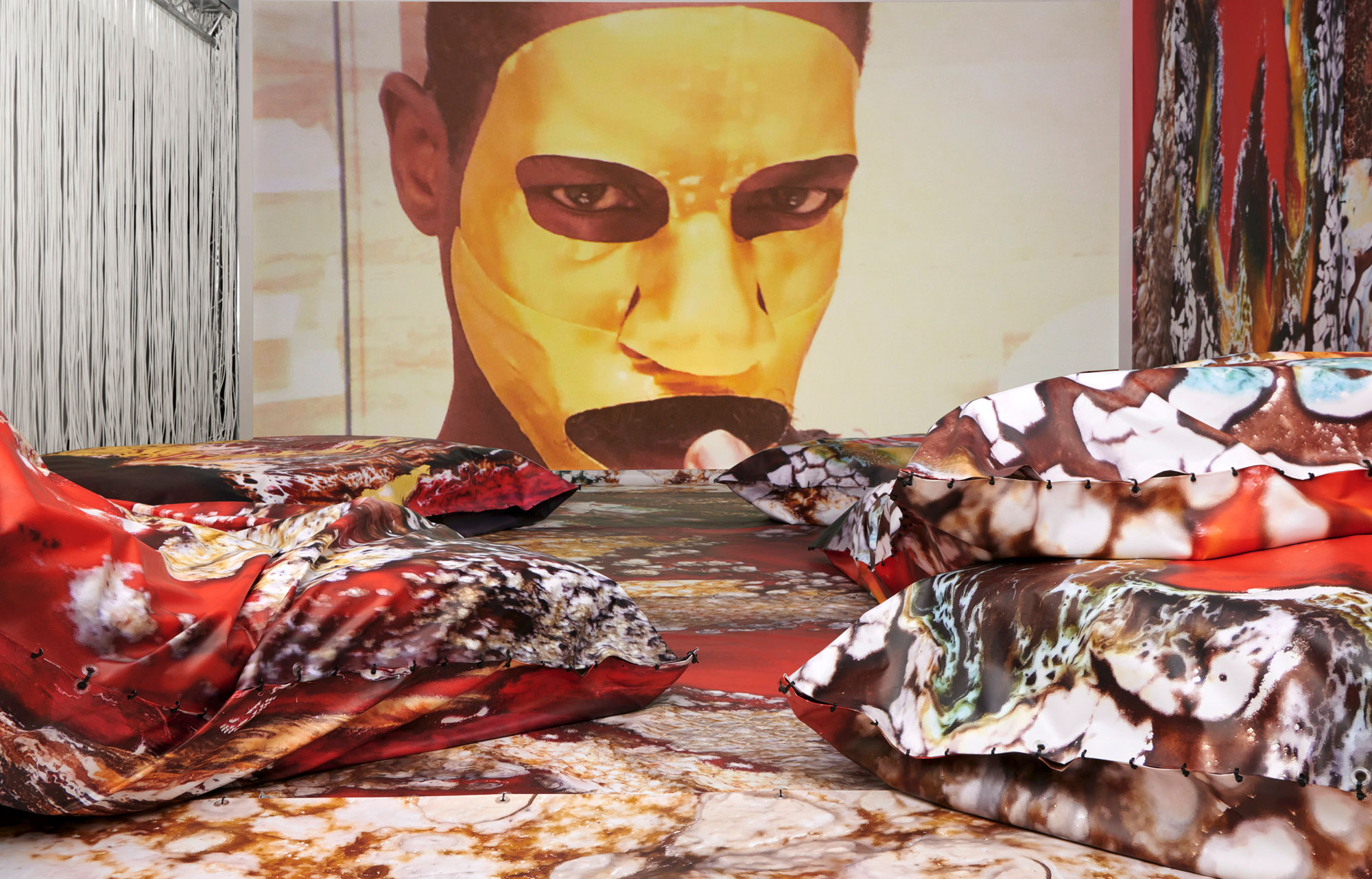 Quelque chose frappe l’esprit. L’artiste semble à l’aise pour dire les choses le plus clairement du monde. Mais il est tout aussi doué pour créer au sens de fabriquer. Il utilise des moyens et des matériaux de designer sourceur aguerri pour construire des objets et investir l’espace de vrais micro-climats. Dans la seconde salle, les visiteurs s’asseyent sur des siège seventies, sorte de sièges oreillers Fat boy géant posés au sol. La toile de ces oreillers géants est imprimée de motifs agrandis de céramique de Vallauris. C’est très confortable mais ça crisse quand on s’assoit, parce que nous sommes en fait assis sur du foin tapissé en siège. Au mur, une projection de 10000 photos sorties de l’IPhone de l’artiste se succèdent, entre moodboard et photos de la vie quotidienne. Le cerveau fait son choix.
