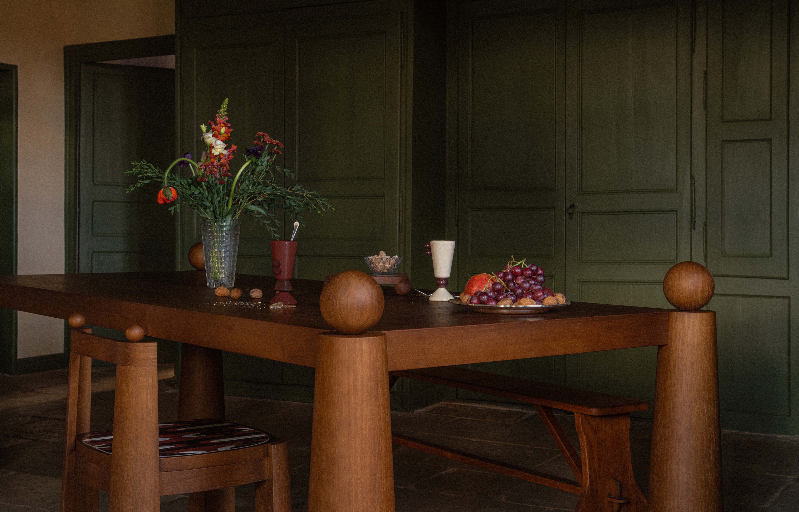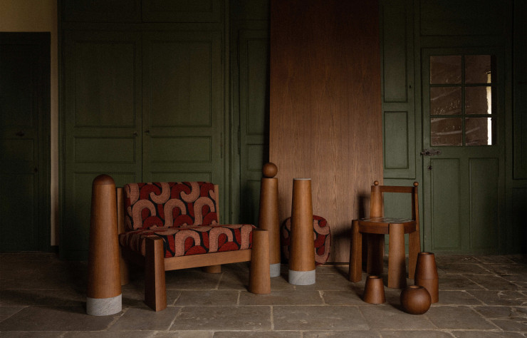 Des intérieurs de leurs aînés, Jonathan et Simon tirent aussi une esthétique agreste qui se reflète dans leur première collection, dédiée aux années 70. Compilés sous le nom 1976, souvenirs rustiques, ses premiers modèles ont été lancés au printemps 2024. Les suivants, et quelques accessoires, seront dévoilés à l’automne. Aujourd’hui sont proposés une chaise, une chauffeuse, une table et une lampe, un fauteuil et un banc. Leur dessin joue de deux éléments : la boule et le cône, dont les dimensions sont adaptées et retravaillées afin de permettre aux meubles d’être personnalisés.