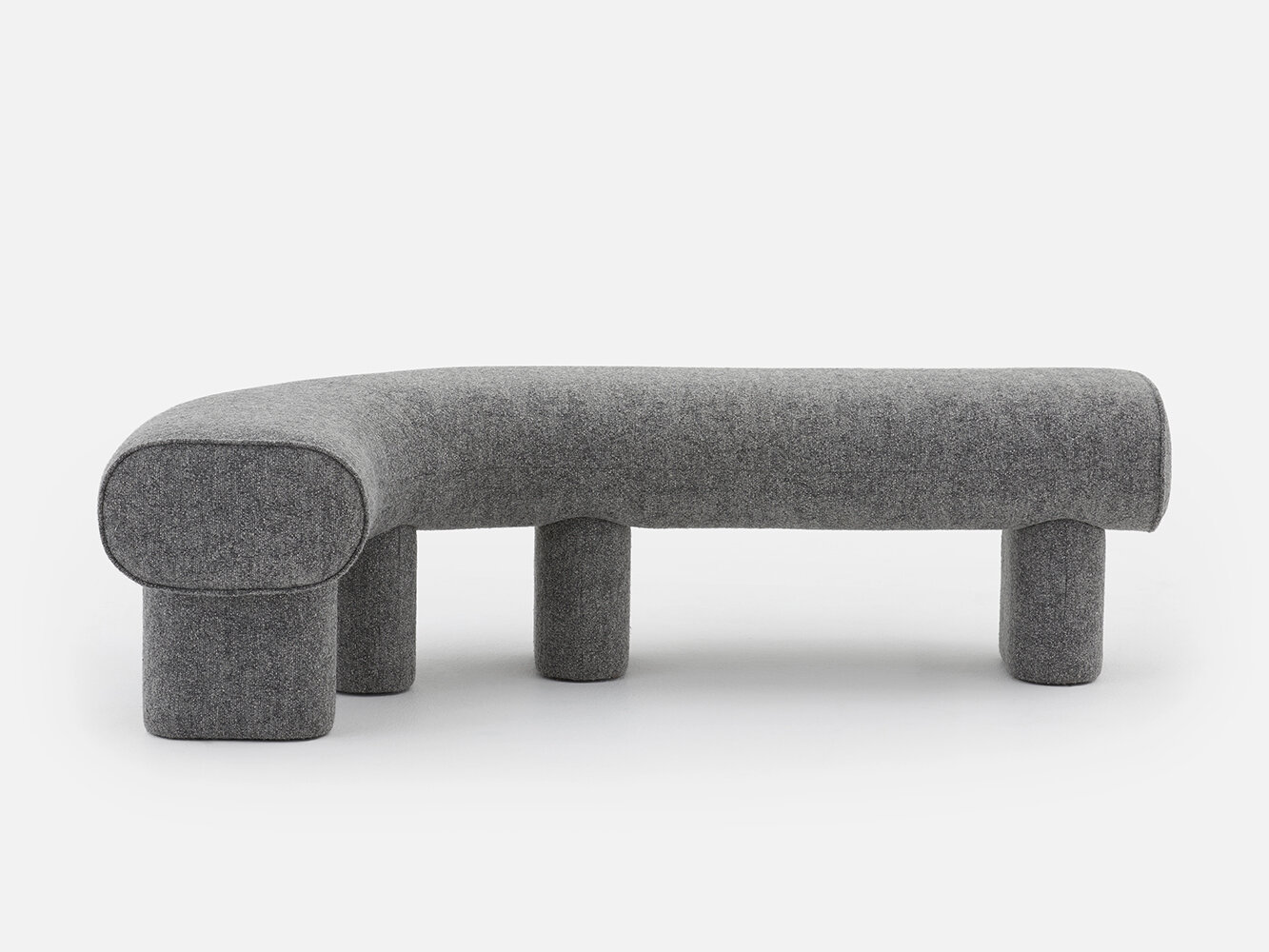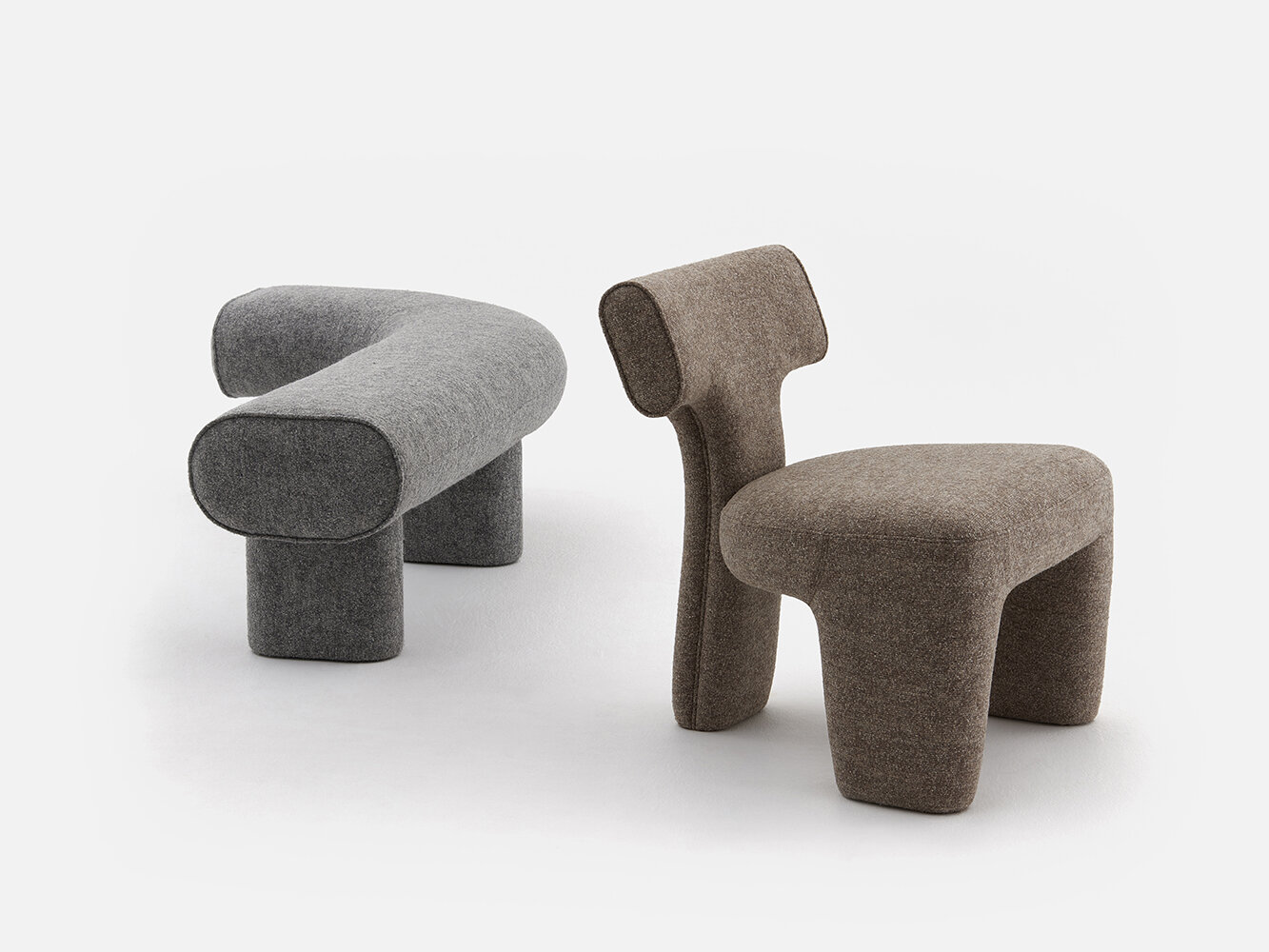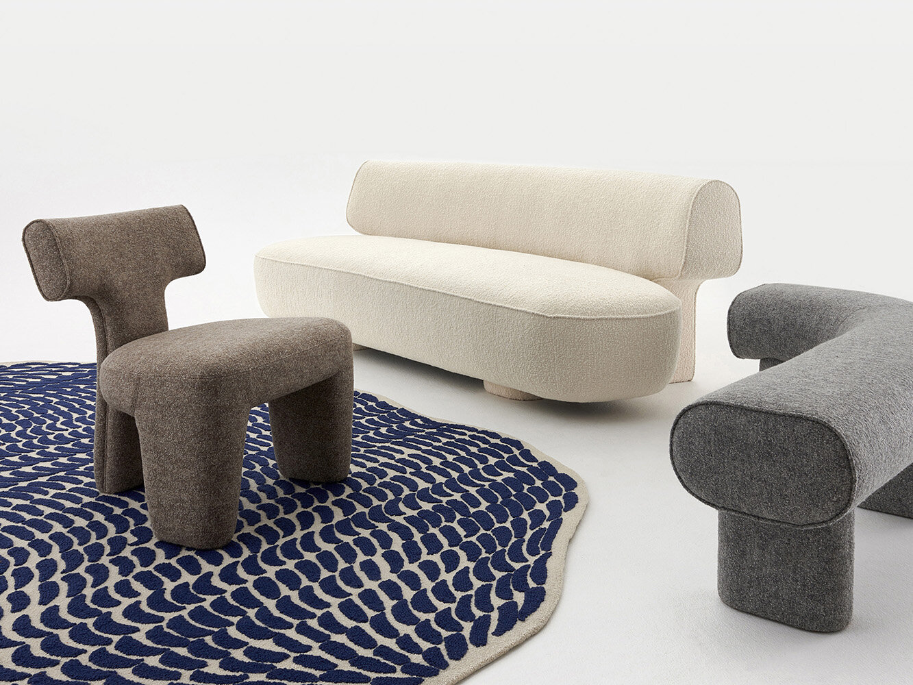 Le tissu est la peau du vêtement. Du toucher naît le ressenti. L’étoffe a donc été spécialement mise au point afin d’avoir la souplesse requise pour tapisser des formes denses et arrondies. Pour le designer, « le confort commence aussi par l’œil ». Enfin, ces meubles peuvent se combiner et créer des configurations aussi originales que sculpturales, dans un salon ou dans un espace de réception. Trois modèles de tapis ont aussi vu le jour. Leur surface est semée de virgules. Le créateur les a dessinées au feutre, trait par trait, sur une feuille A3.
