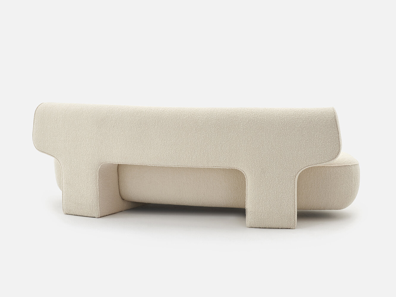 Un canapé, une chauffeuse, un banc. Trois pièces aux formes généreuses tournant le dos aux codes classiques et qui rappellent, dans un autre registre, le travail en marbre et en bois dont Guillaume Delvigne est coutumier. Le talentueux designer a conçu très librement la nouvelle collection de mobilier « Litho » pour la maison Pierre Frey. De fait, celle-ci, fondée en 1935, a toujours été en contact avec des créateurs, par définition innovants et inattendus. Côté tissu, il a opté pour le bouclé, à l’instar des canapés de Jean Royère, mais sans craindre de verser dans le revival devenu un peu la tarte à la crème de la décoration. Car cette collection n’a rien de néo-vintage !