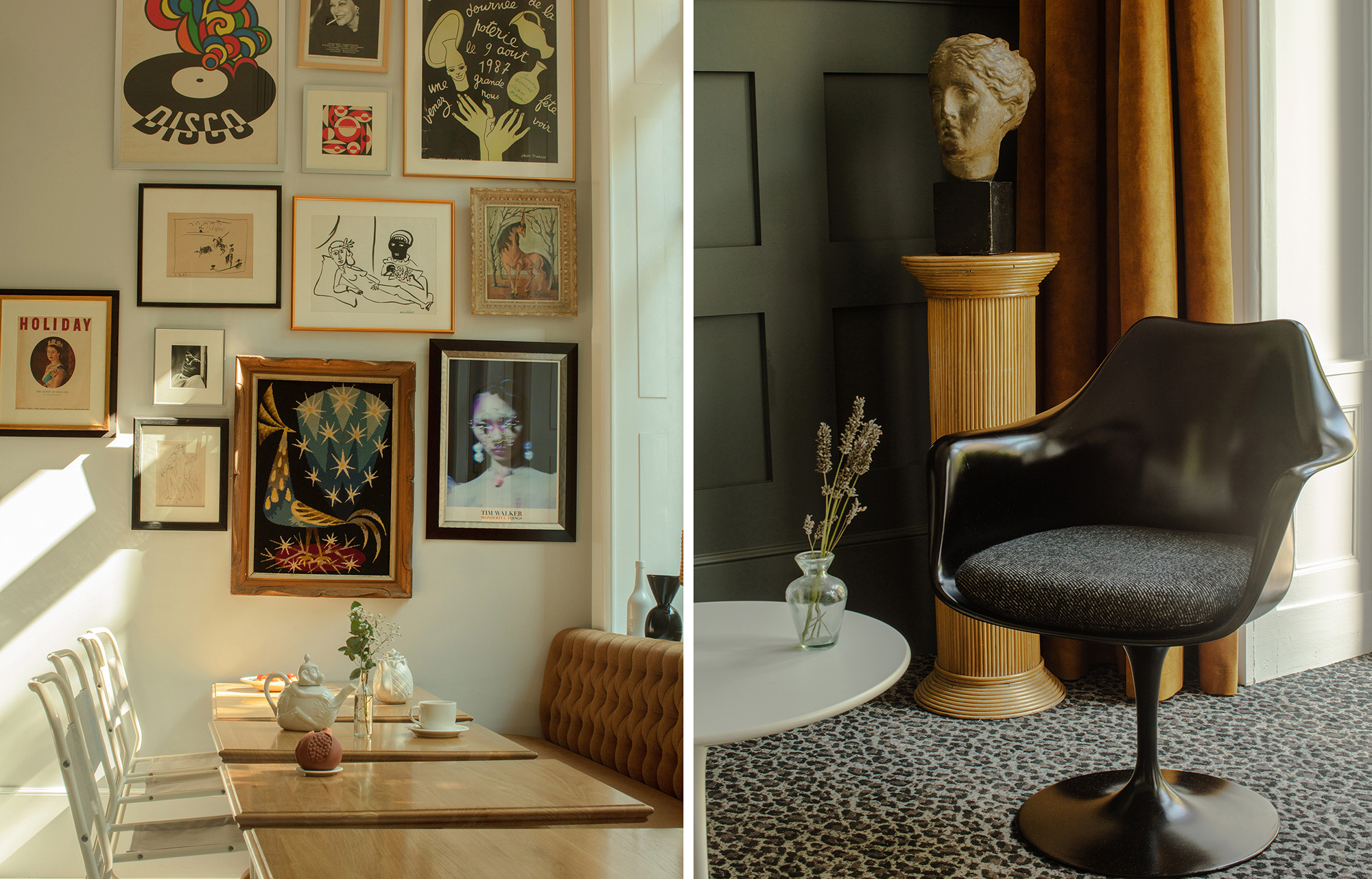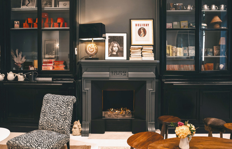 Aux murs ou sur les étagères trônent leurs propres collections de livres, d’affiches et de mugs royaux, rendant les lieux naturellement vivants. Ainsi, d’une photo surannée au poster promotionnel de l’exposition Tim Walker qui s’est tenue au V&A de Londres, l’éclectisme guide le décor de l’hôtel de Verdun 1882, jusqu’à mixer des imprimés animaux au sol avec de grands classiques du design.