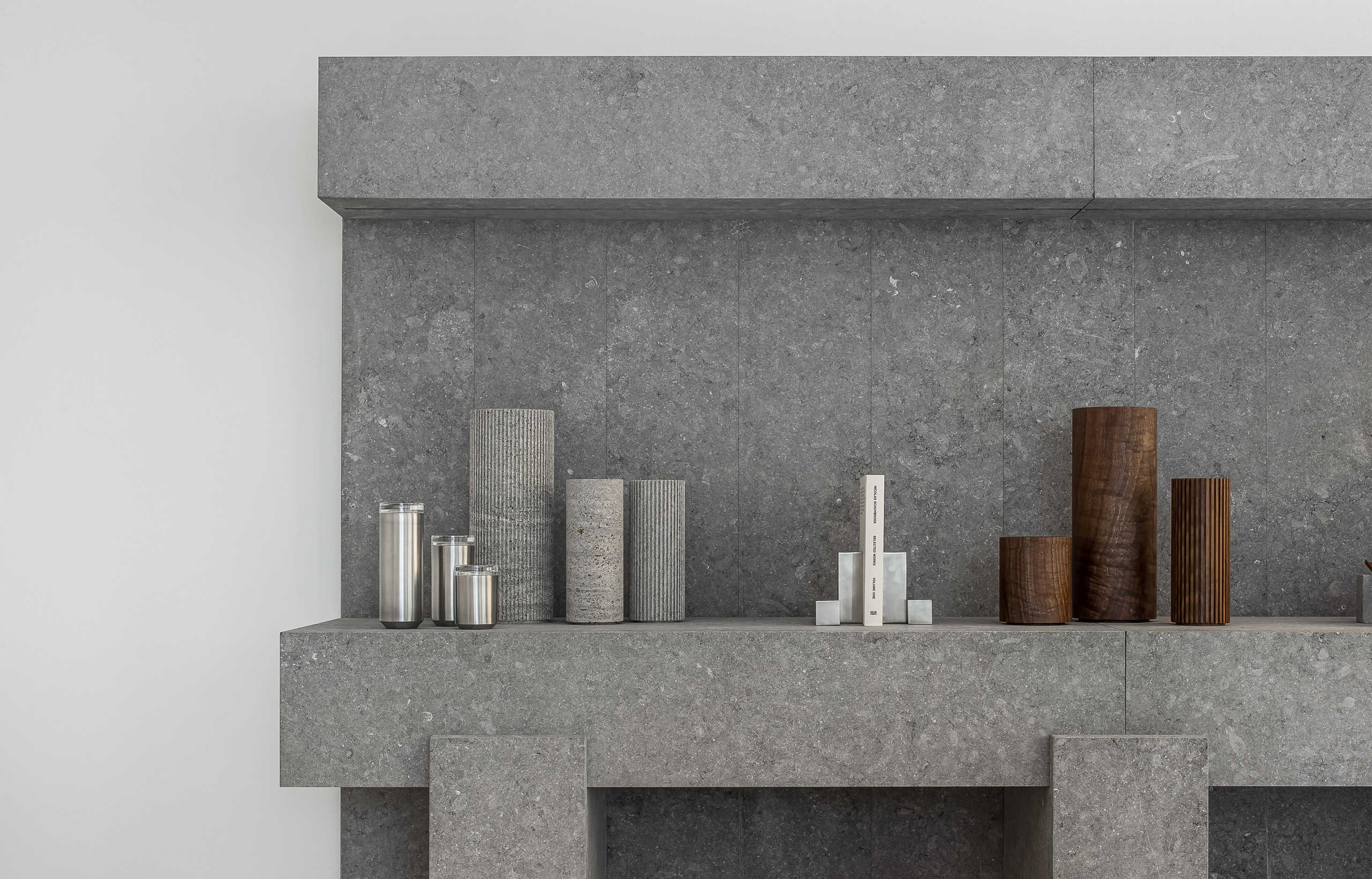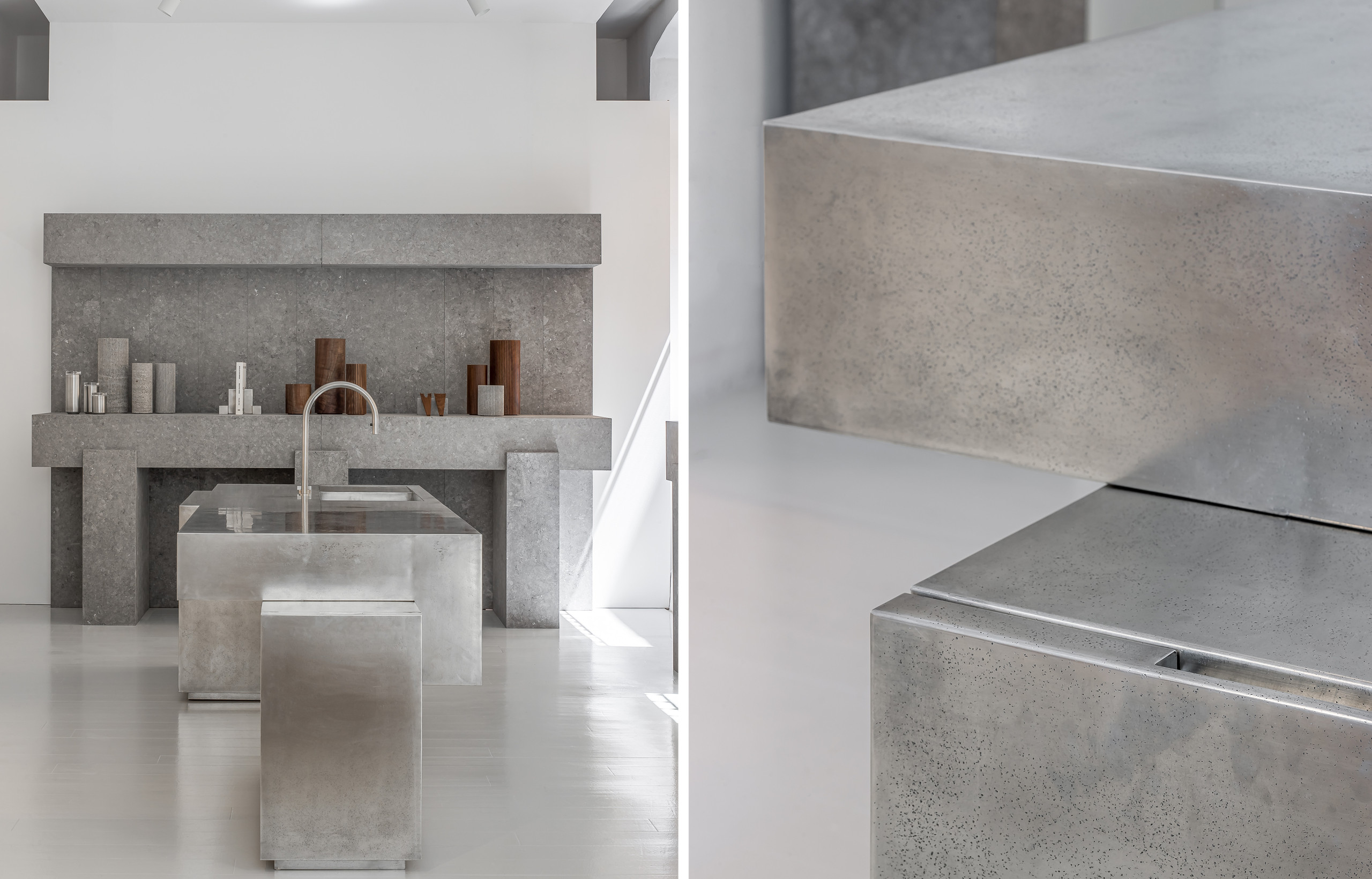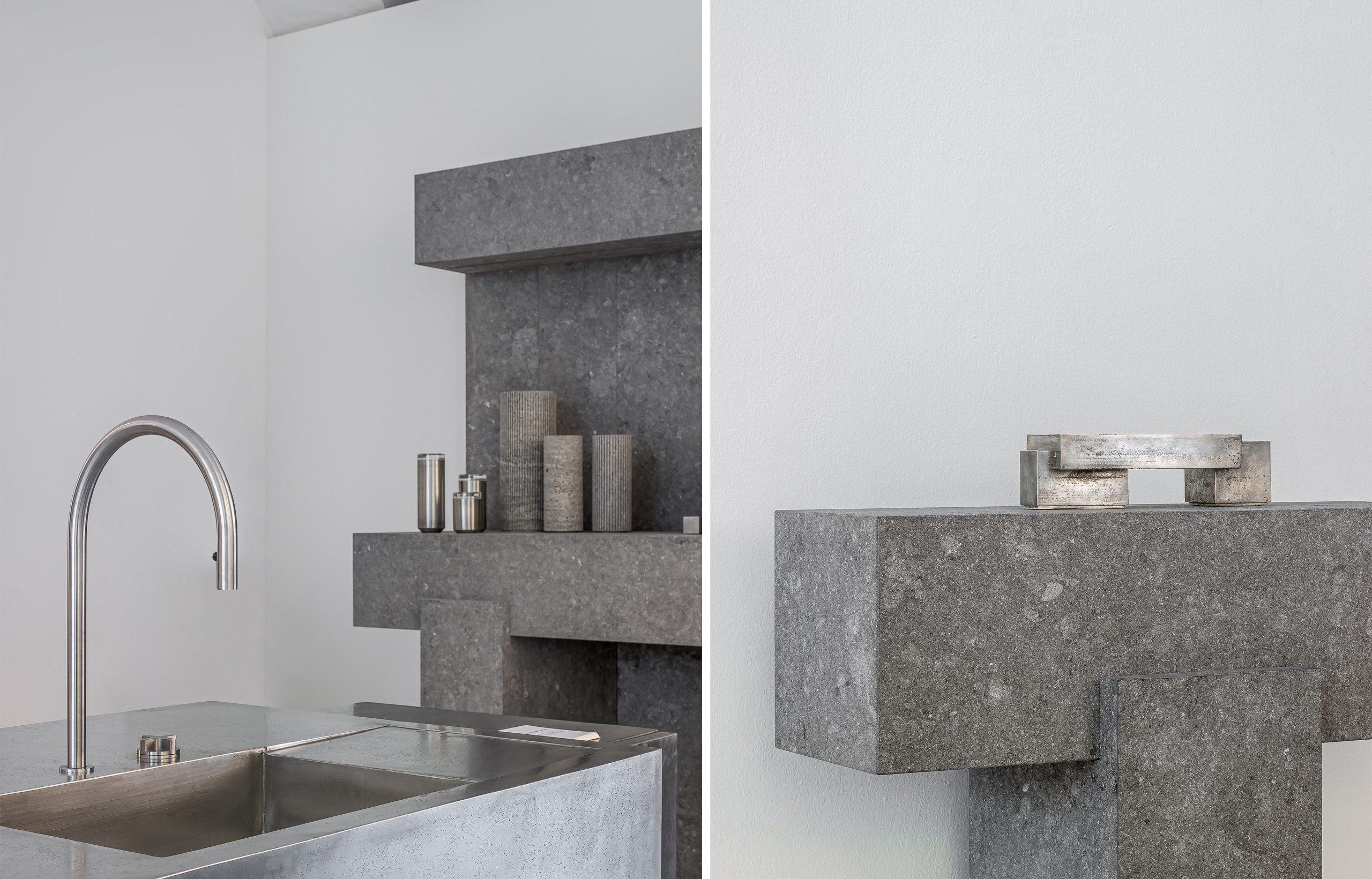 « C’est vraiment une histoire belge, au sens géographique du terme, entre moi qui suis basé à Bruxelles, Obumex qui est une marque très reconnue dans le pays, mais aussi à l’international, et l’artisan qui a réalisé la cuisine, avec lequel nous travaillons sur d’autres projets de mobilier, indique Nicolas Schuybroek. Ce qui est beau avec l’étain, contrairement à l’Inox que l’on est habitué à voir en cuisine, c’est la chaleur et la profondeur que révèle cette matière étonnante. Cette création imaginée comme une sculpture se compose de trois blocs posés les uns sur les autres, qui se combinent et offrent diverses perspectives selon l’angle de vue. »