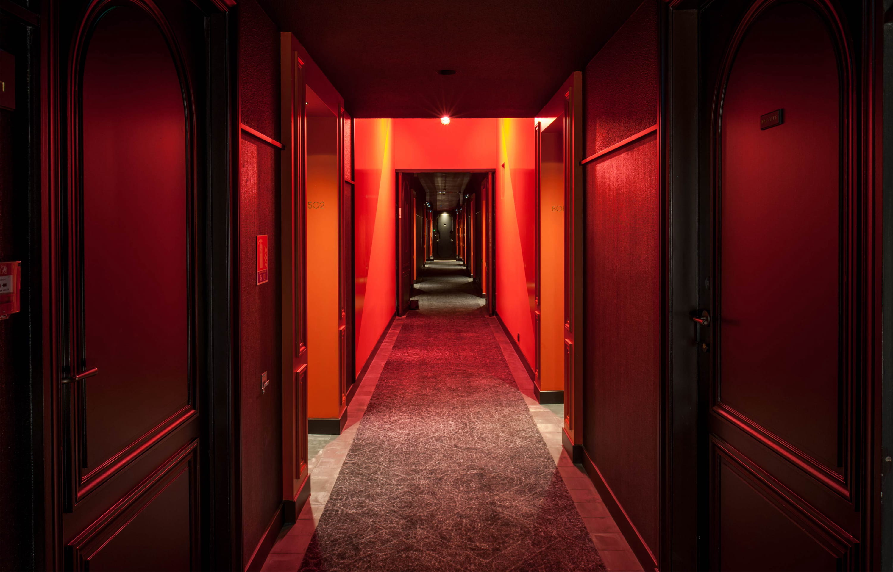 Coursives longées de vitraux évocateurs, lourdes portes à heurtoirs trempées dans le rouge cardinal, effluves d’encens et de benjoin, le tout à la lueur d’un authentique chandelier pour guider vos pas. Non, vous n’êtes pas exactement dans l’antre moderne du Divin Marquis, même cela y ressemble beaucoup, mais au Sinner. Hommage appuyé à l’héroïne des Malheurs de la vertu, la suite Justine – la seule de l’hôtel – est la porte ouverte à tous les libertinages. Au seuil du salon librement langé dans les années 70 – le catéchisme stylistique de l’architecte Tristan Auer est à saluer –, piles d’ouvrages érotiques à même le sol, écran du vidéo-projecteur encore vierge, vinyles et platine à dispo, carafes d’alcools fins… L’espace saturé de références incite à la désobéissance et s’annonce comme l’antichambre diablement lubrique de toutes les tentations.