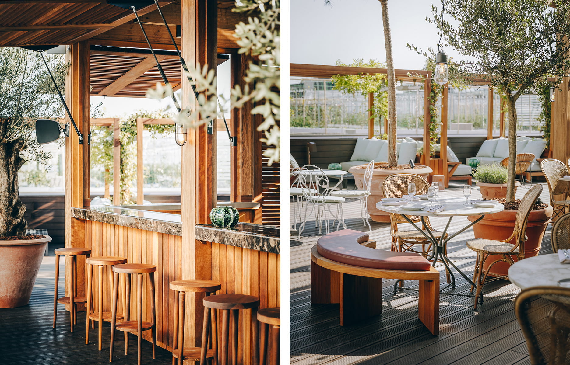 Non content d’avoir lancé la tendance des rooftops parisiens festifs et fait monter la sauce depuis sept ans entre Ménilmontant, le BHV Marais, le Pavillon Puebla et la gare de l’Est, Le Perchoir prend encore de la hauteur, au sud-ouest de la capitale cette fois. Le nouvel opus partage l’immense toit du hall 6 de Paris Expo Porte de Versailles avec Nature Urbaine, qui ambitionne d’être la plus grande ferme urbaine en toiture d’Europe (14 000 m2). De quoi approvisionner le restaurant et son bar superlatif (250 m2 à l’intérieur et une terrasse de 500 m2) en fruits et légumes de saison du voisin et autres mezze. Côté déco, Studio Perrier a pallié l’absence de vue en planchant sur la nature, l’artisanat et le sur-mesure (subtils enduits, céramiques, vitraux, mobilier), donnant ainsi des airs de pergola géante à l’ensemble.
