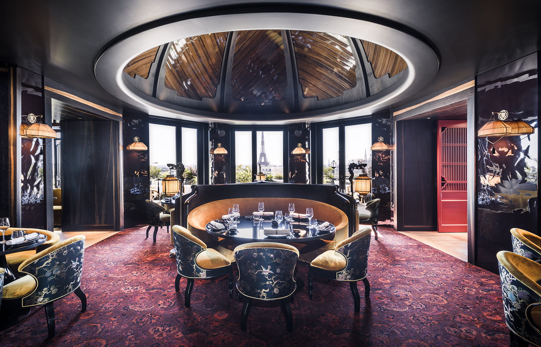 Ce mois-ci, le Tout-Paris monte aux Champs-Élysées pour admirer MUN, dernier ciel en date à voir le jour. L’effervescent groupe Paris Society mise sur une Asie fantasmée pour hausser la température, tant dans le décor que dans les verres et les mets. Vertiges opiacés, coupole à faire tourner la tête et vue mythique donnent le ton « in the MUN for love ». Entre pagode, salon chinois, bar à sushis pop et luxuriante terrasse pour 130 couverts, les mondanités ont des couleurs « de film noir, de Lotus bleu, les charmes d’un wagon Pullman, irrésistible climat où se mêlent les opulences de tissus, plafond écrin, lumières en sourdine de lampion, laques, bois sombres et alcôves ménageant le voir et l’être vu jusqu’à ce que les portes ne coulissent sur un nouveau suspense ». Histoire de mettre la barre très haut.