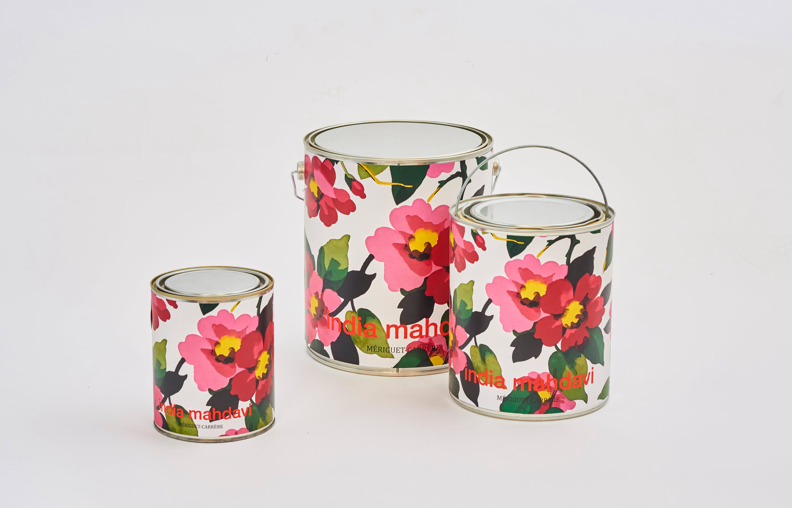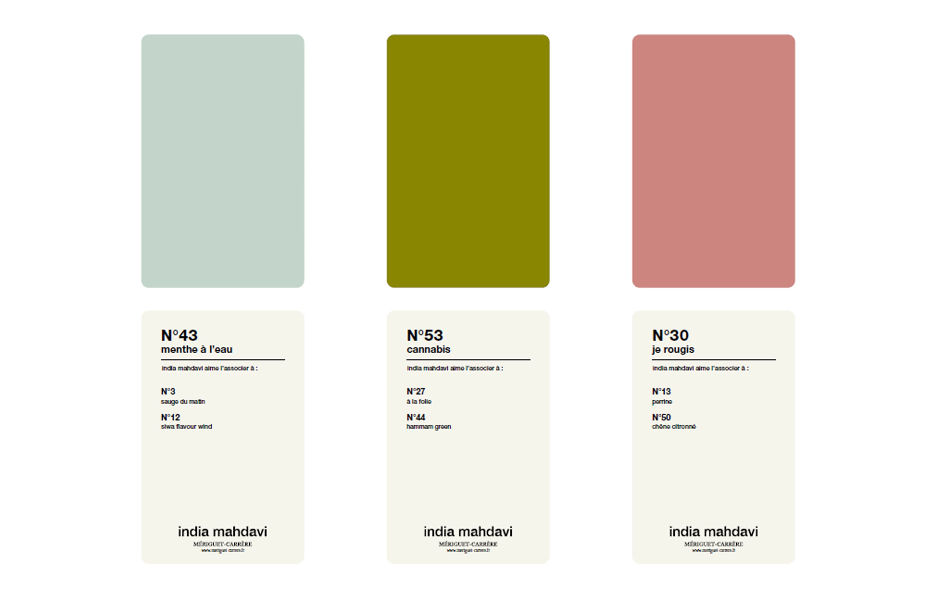 Pour sa première incursion dans l’univers de la peinture, India Mahdavi s’est associée à la maison française Mériguet-Carrère, fondée en 1962 par Paul Mériguet. Cet expert en couleurs s’occupait de la scénographie de sa troupe de théâtre avant de se spécialiser dans la réalisation et la restauration de décors peints (il intervient à l’Opéra Garnier, au palais de l’Élysée…). Depuis plus de vingt ans, il propose ses propres peintures, développant des harmonies subtiles. Du vert Cannabis au rose Je rougis en passant par le Mandarine au lait ou Hilda (le prénom de sa grand-mère), l’architecte d’intérieur et grande coloriste livre une palette de 56 nuances teintées d’humour pour cette collection « Flowers », révélée en septembre dernier.