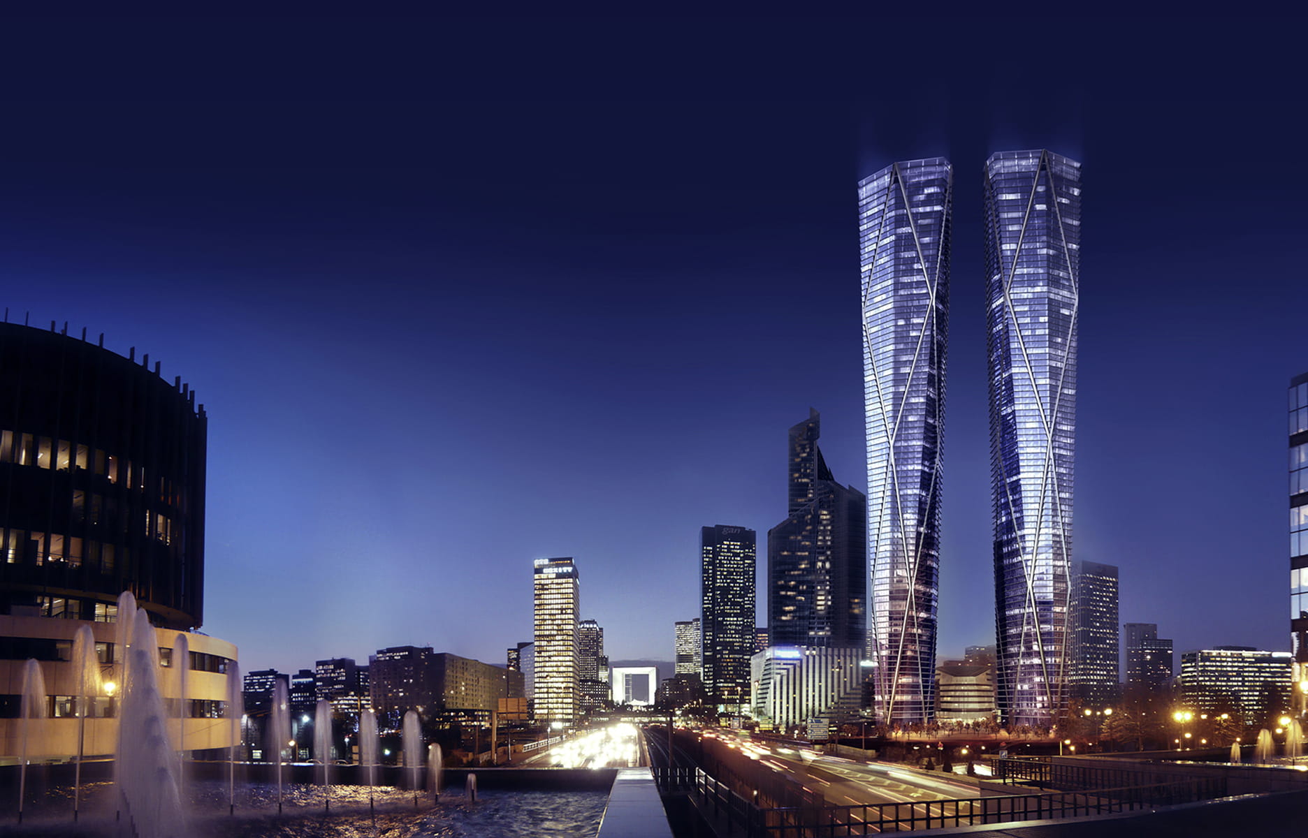 Situés le long de la Seine, à Courbevoie, les bâtiments doivent symboliser la nouvelle porte d’entrée du quartier d’affaires de la Défense, initié dans les années 60, en y apportant la mixité d’usages qui lui fait défaut. En plus des 40 000 m2 de bureaux, le projet se destine donc à accueillir un hôtel cinq-étoiles, une douzaine de restaurants, un spa, une piscine, des commerces de luxe et appartements panoramiques, ainsi qu’une galerie et un auditorium hébergés avec d’autres bureaux au sein de trois bâtiments, plus modestes, qui s’ajoutent aux tours pour encadrer une place publique tournée vers le fleuve.