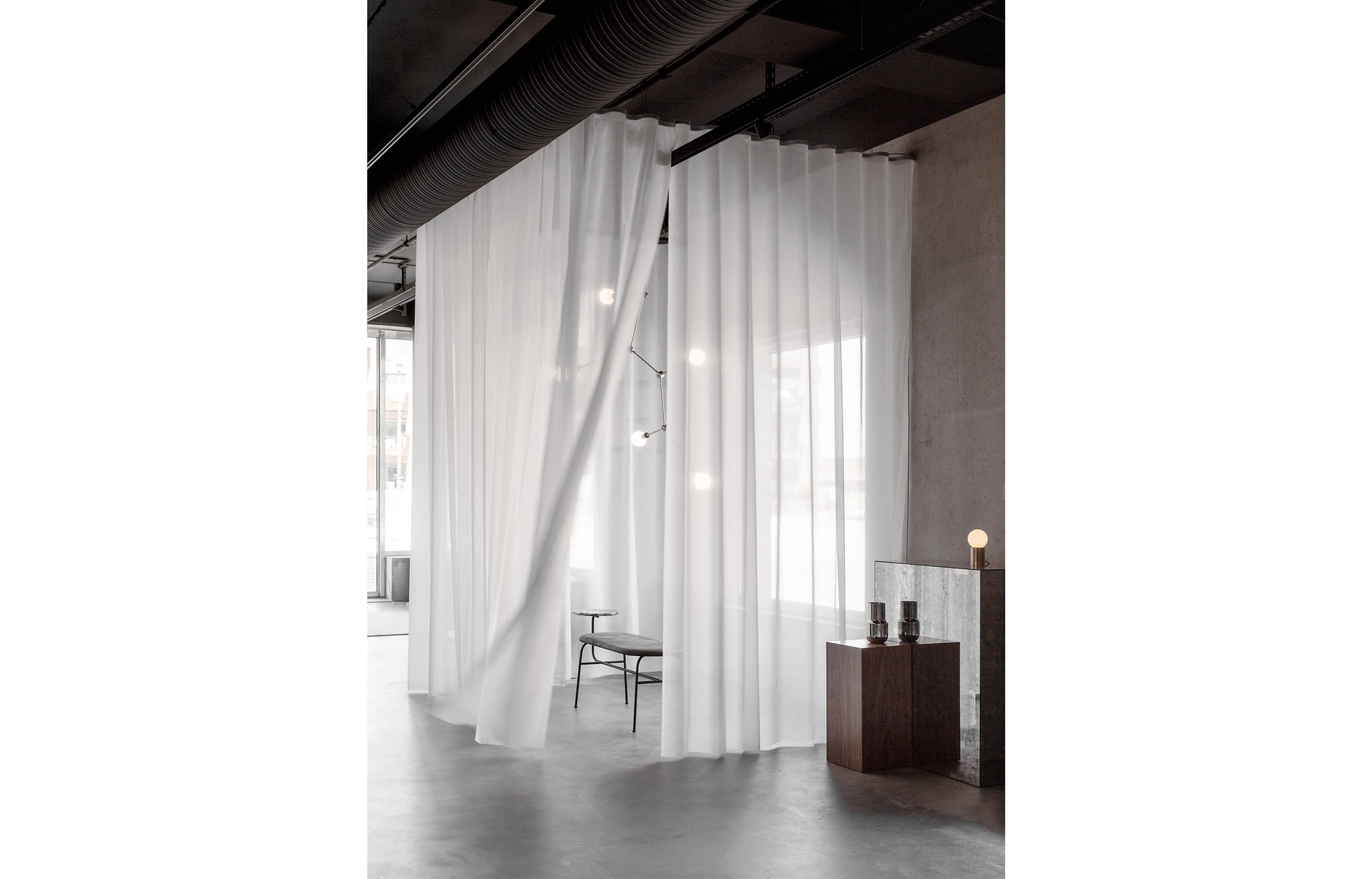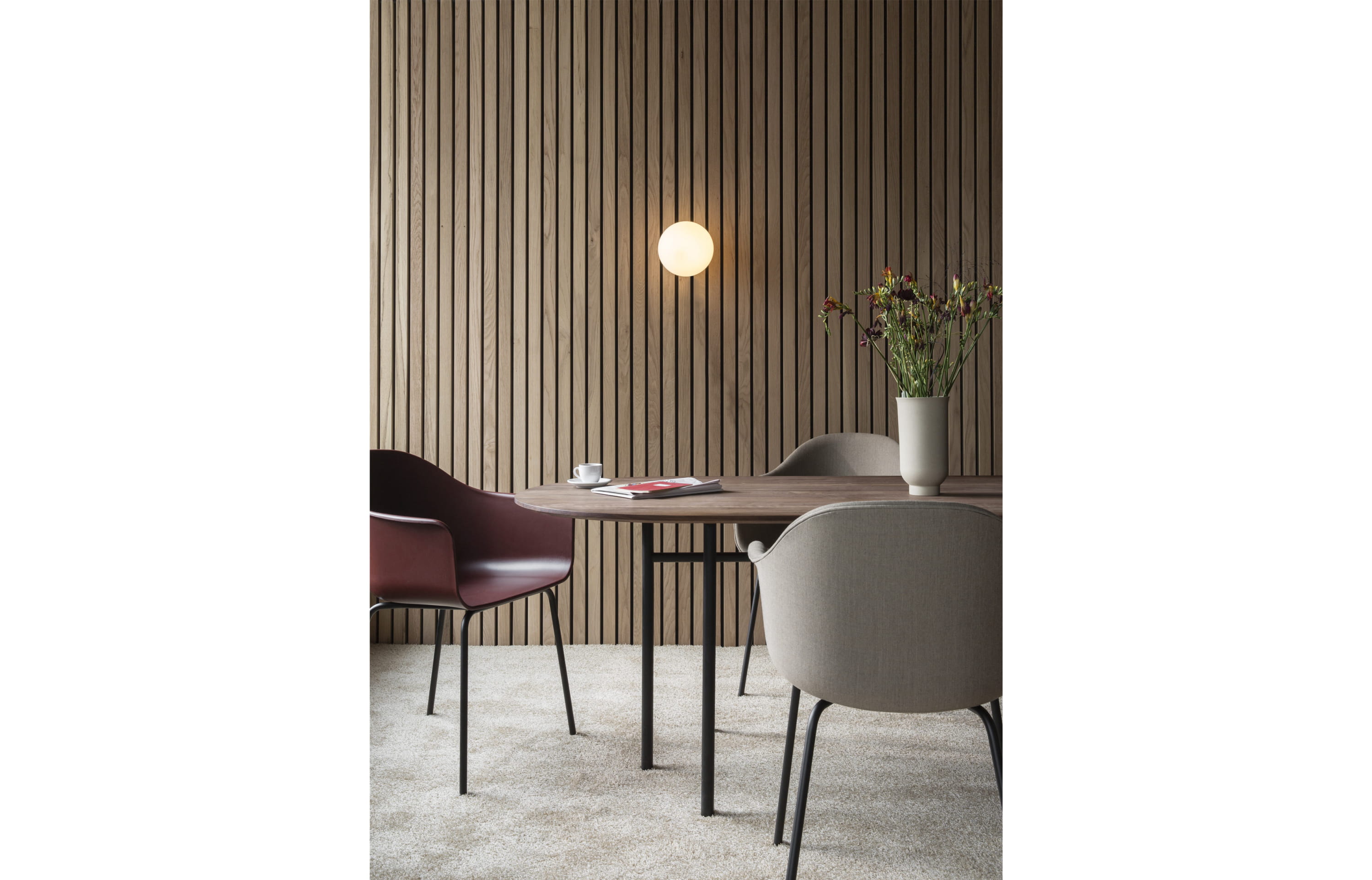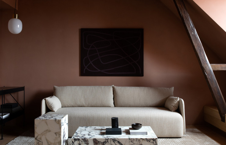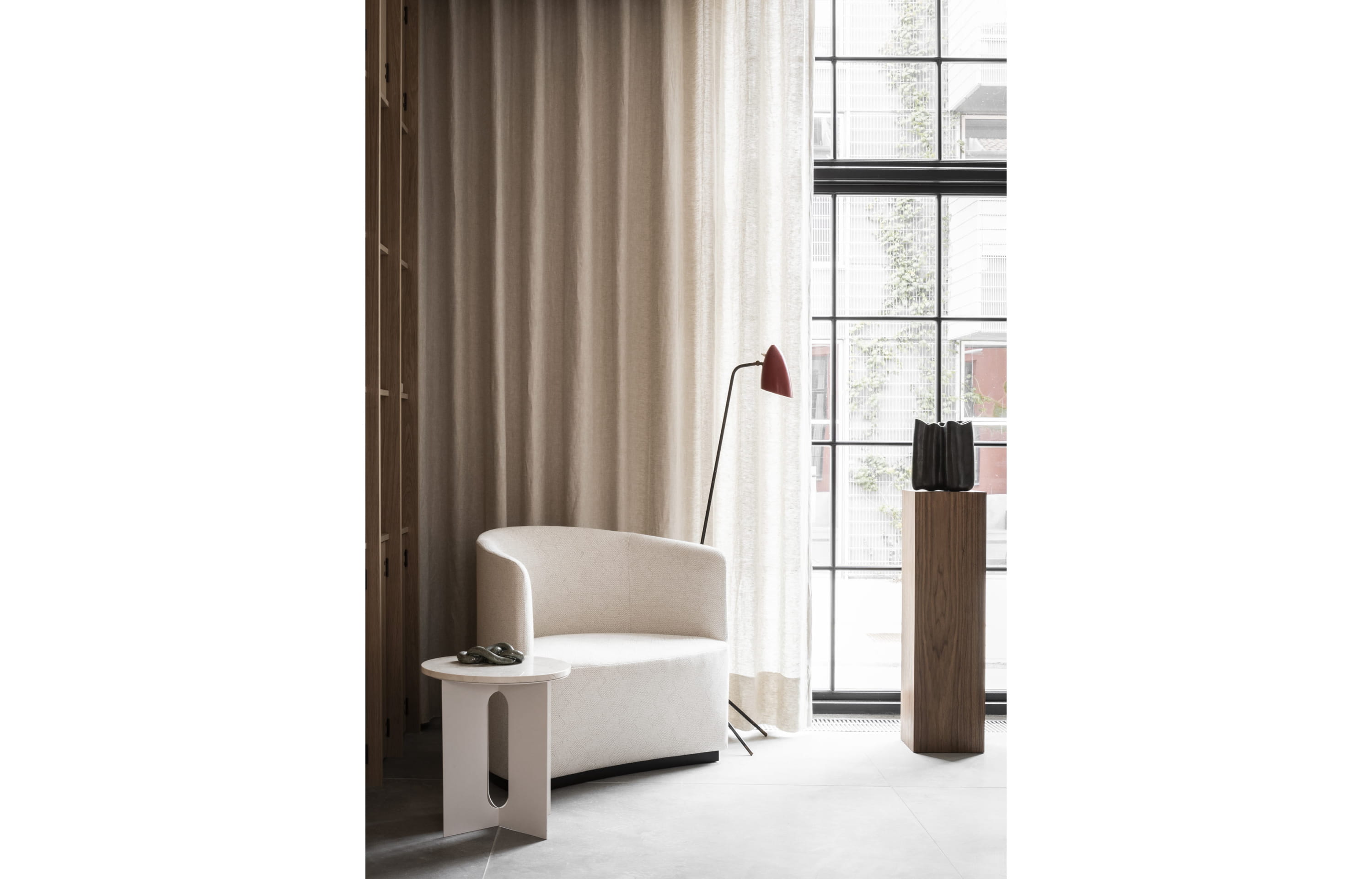 Sous un même toit, on trouve donc une zone de coworking, un concept-store pouvant accueillir des espaces pop-up soigneusement curatés (en septembre a ainsi eu lieu une vente de vestes Chanel vintage), une bibliothèque de matériaux, un restaurant, un café et, enfin, un hôtel confidentiel de quelques chambres, The Audo Residence, avant tout pensé pour les amis de passage. Le tout constitue un showroom nouvelle génération pour Menu où les créations de Norm Architects s’épanouissent idéalement. S’y rendre offre l’occasion de paresser dans le fauteuil lounge Harbour mais ajoute une dose de ce confort contemporain si indispensable aux millennials ; ou de lire l’une des revues sélectionnées avec exigence par Ofr Copenhague dans le canapé bas modulable Eave, dont la silhouette, rigoureusement graphique et néanmoins sensuelle, est inspirée par les corniches architecturales. On peut aussi y déguster un thé servi dans la théière Kettle en verre, posée sur ce monolithe de marbre qu’est la table basse Plinth…