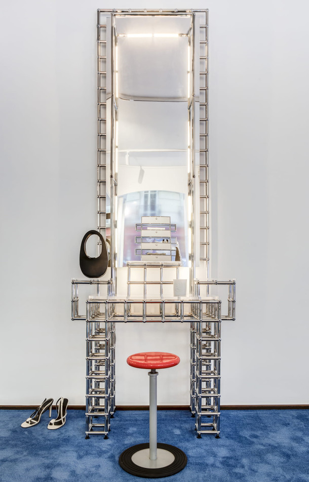 USM s’associe à Coperni ! Au sein de son showroom parisien, l’éditeur de mobilier présente jusqu’au 30 janvier « World Wide Home », une scénographie imaginée par Sébastien Meyer et Arnaud Vaillant, les deux créateurs de la griffe de mode. Anciens directeurs artistiques de Courrèges, ils réinterprètent aujourd’hui l’imaginaire propre à Internet : Innovation, technologie, modernité… Des valeurs aussi chères à leurs yeux qu’à ceux d’USM, matérialisées par un bureau, une bibliothèque, une coiffeuse, un lit et un semainier qui vantent le potentiel de personnalisation du système USM Haller. Le tout évidemment parsemé de quelques vêtements et du fameux Swipe Bag du label parisien.