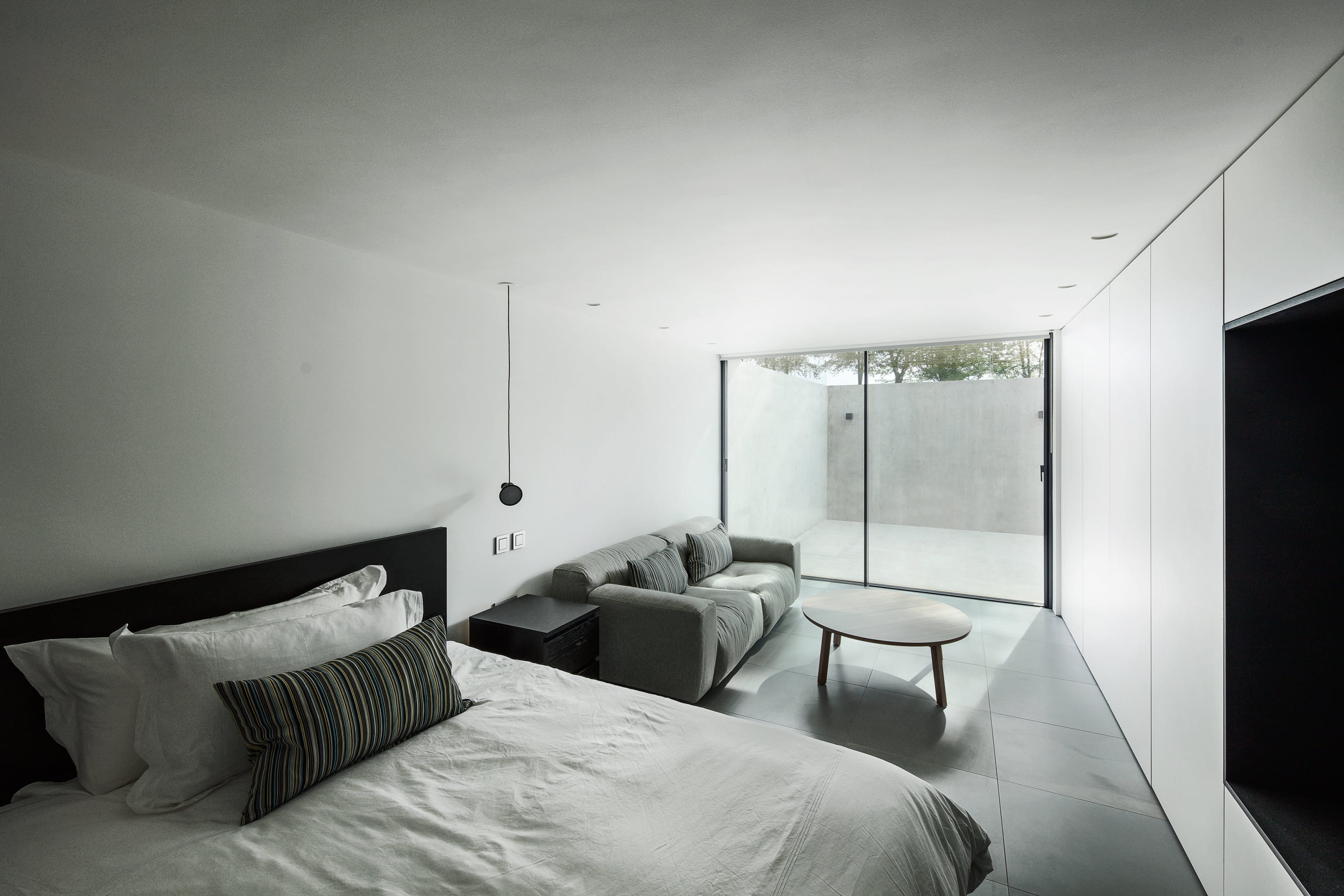 Conçue comme un seul bloc, l’extension comprend une cuisine, une salle à manger et deux chambres de plain-pied, tandis qu’un espace semi-enterré en accueille une troisième, un patio et un garage pour éviter de juxtaposer un volume trop massif à la maison existante. Entièrement autonomes, les deux habitations sont tout de même reliées par un sas vitré ainsi qu’un jeu de toitures qui harmonise l’ensemble.