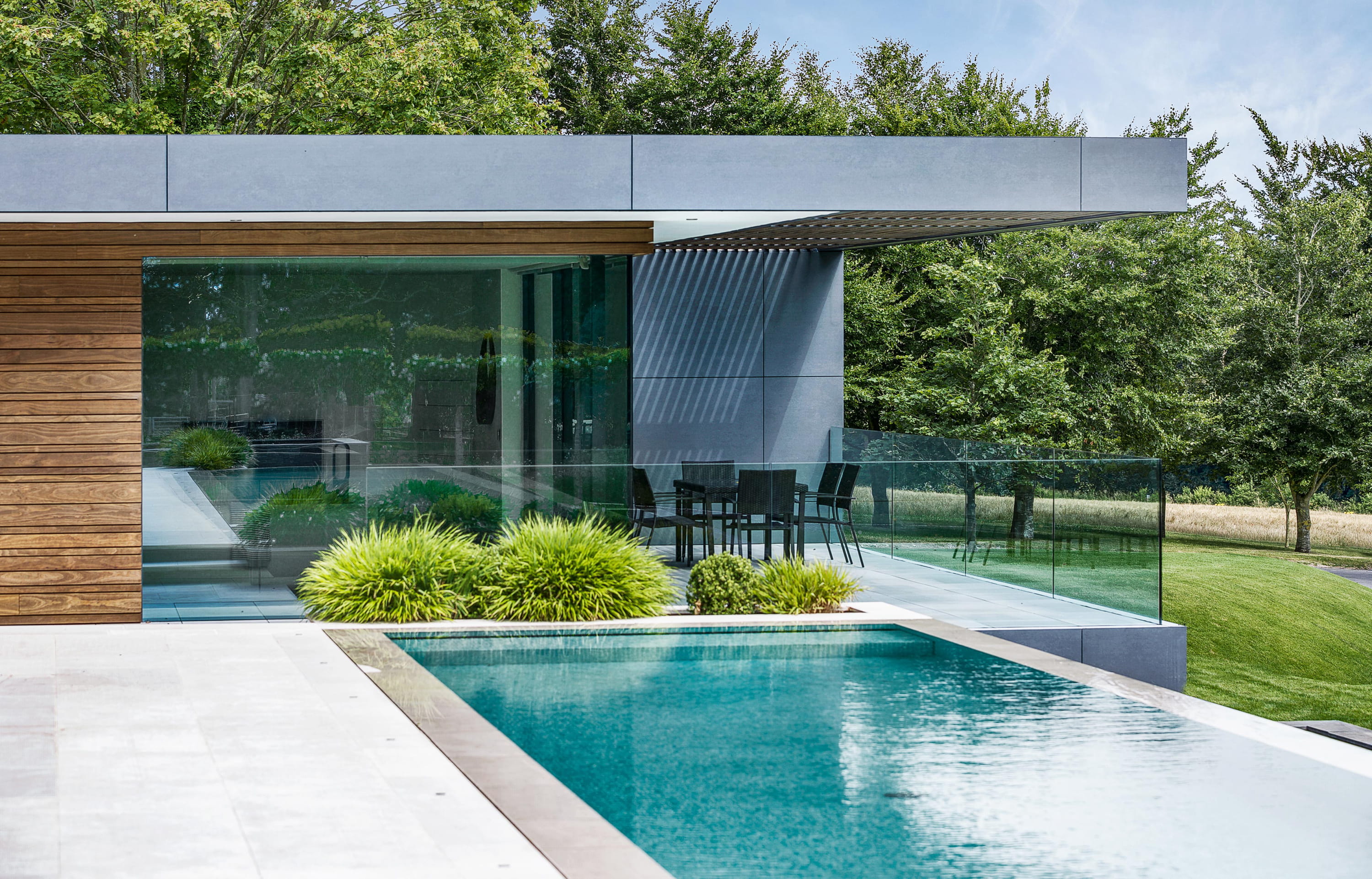Habillée de zinc au nord et en toiture, l’ancienne maison dialogue aussi avec le revêtement en fibre de ciment qui encadre les parties récentes. Des teintes grises qui répondent en plus aux carreaux de béton employés pour le sol de l’extension, à l’intérieur comme sur la terrasse, et à la pierre d’un bassin situé en contrebas de la piscine pour marquer l’entrée du jardin.