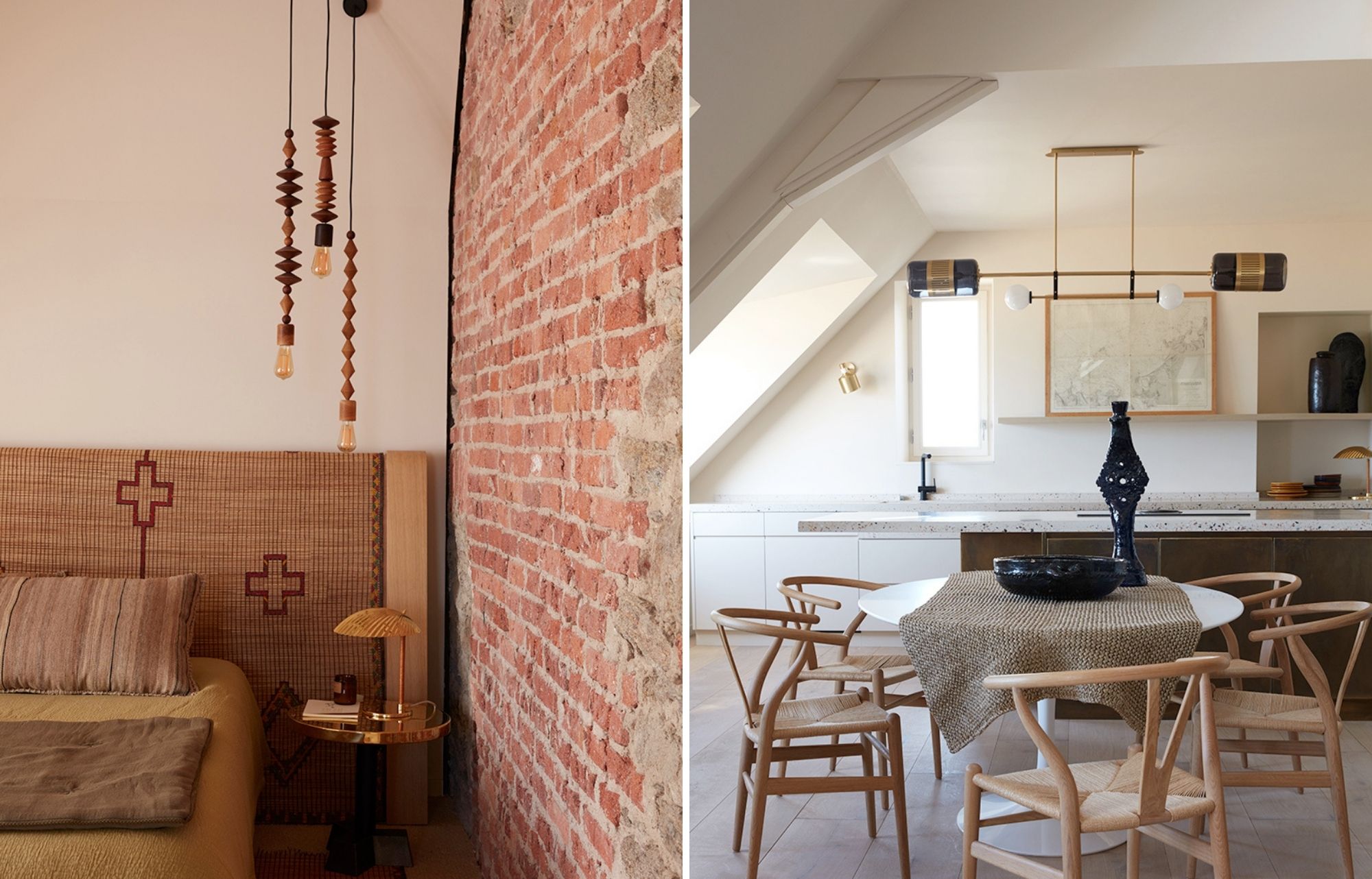 Cette mise à nu a permis de dévoiler la charpente en bois et les murs de brique que de précédents travaux – notamment des faux plafonds – avaient dissimulés. Afin de créer du volume, l’architecte a également percé le plancher d’étage pour créer un séjour-cathédrale en double hauteur au cœur du duplex. Et dans l’entrée, le mur de brique existant a été largement ouvert, nécessitant une reprise structurelle en béton qui ne cherche pas à se cacher.