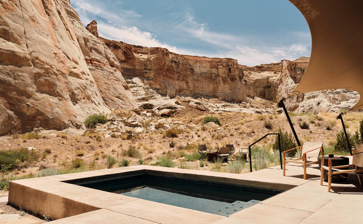Au Camp Sarika, tous les records de glamping – ce mot-valise agaçant, fusionnant glamour et camping – sont pulvérisés. Imaginez l’aridité de l’Utah, avec ses folles concrétions et ses buissons d’herbes sèches, rien que pour vous. Au beau milieu d’un cirque rocheux, non loin de l’hôtel Amangiri, le groupe Aman a planté les larges tentes du Camp Sarika.