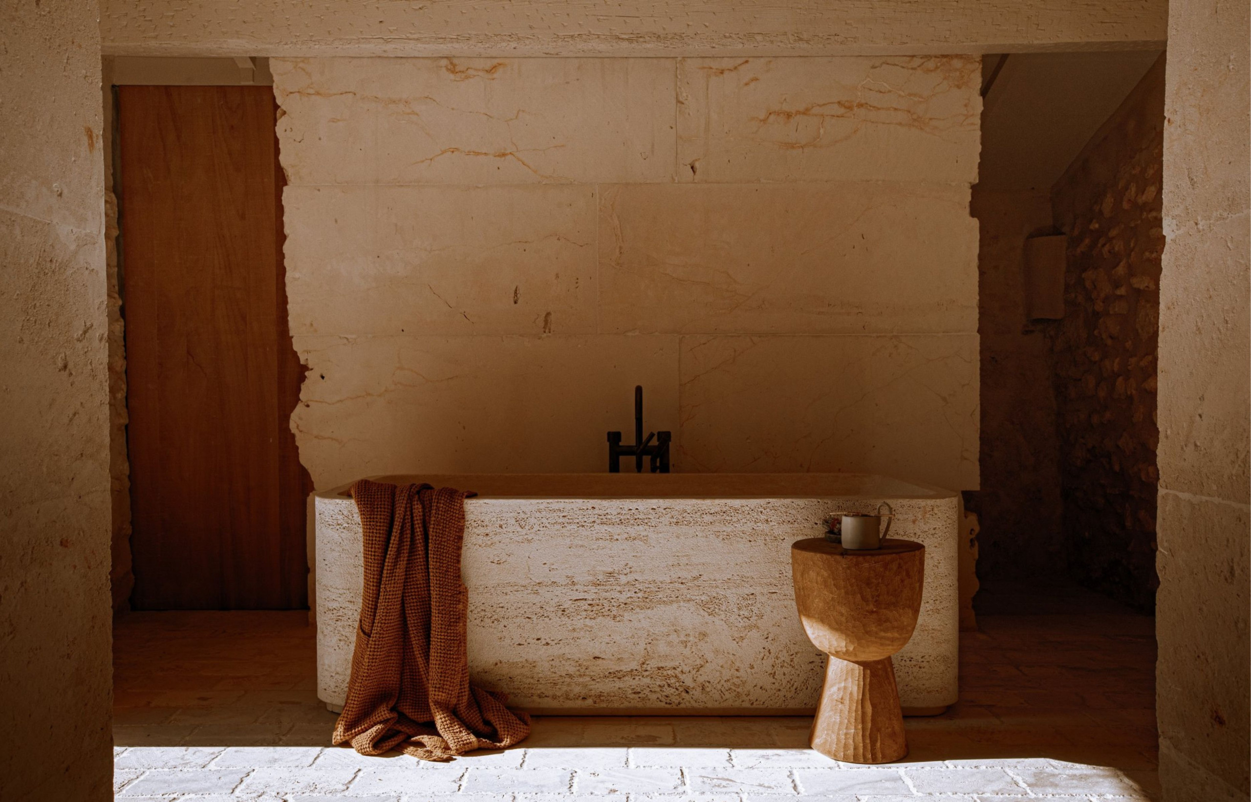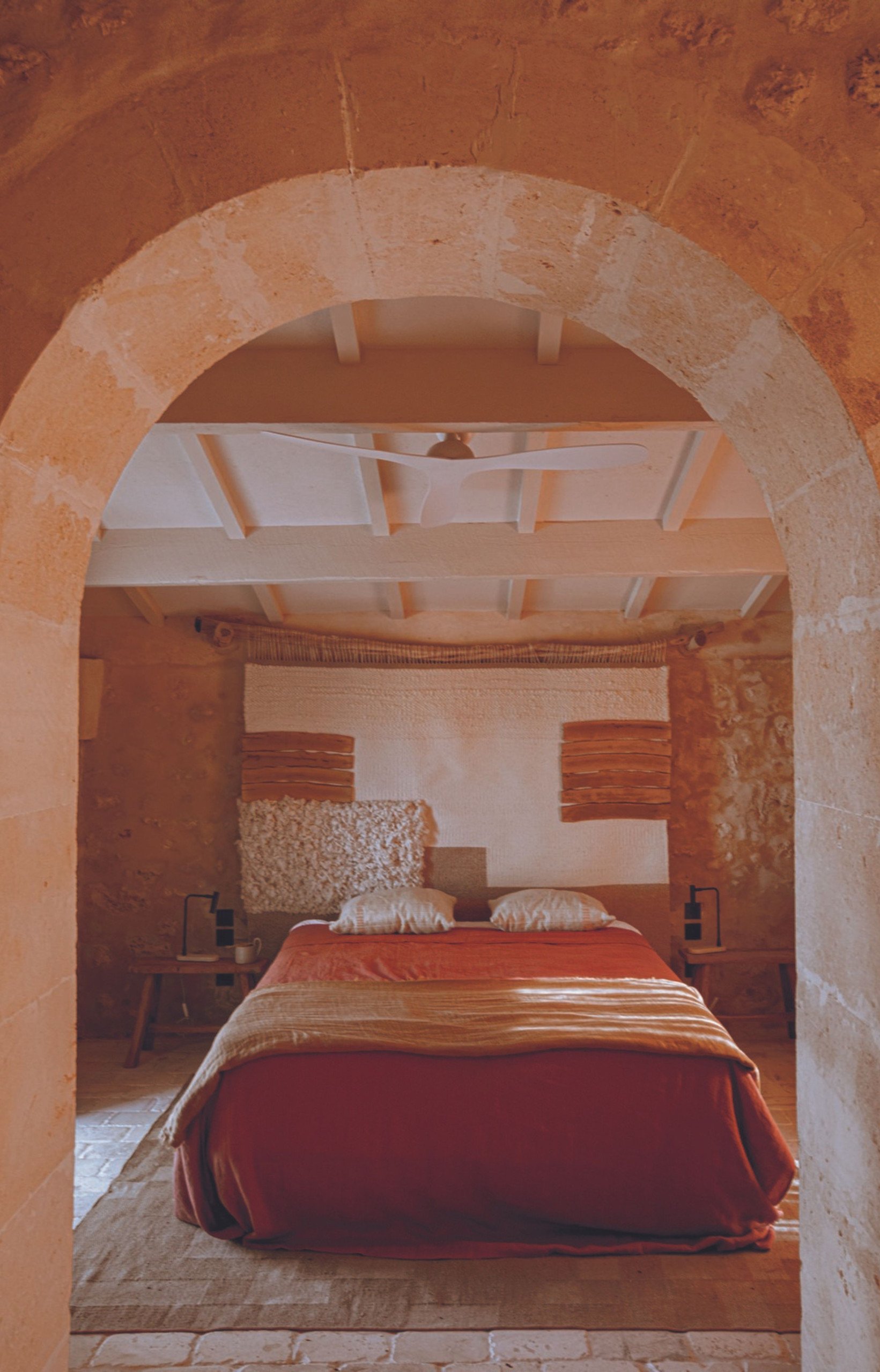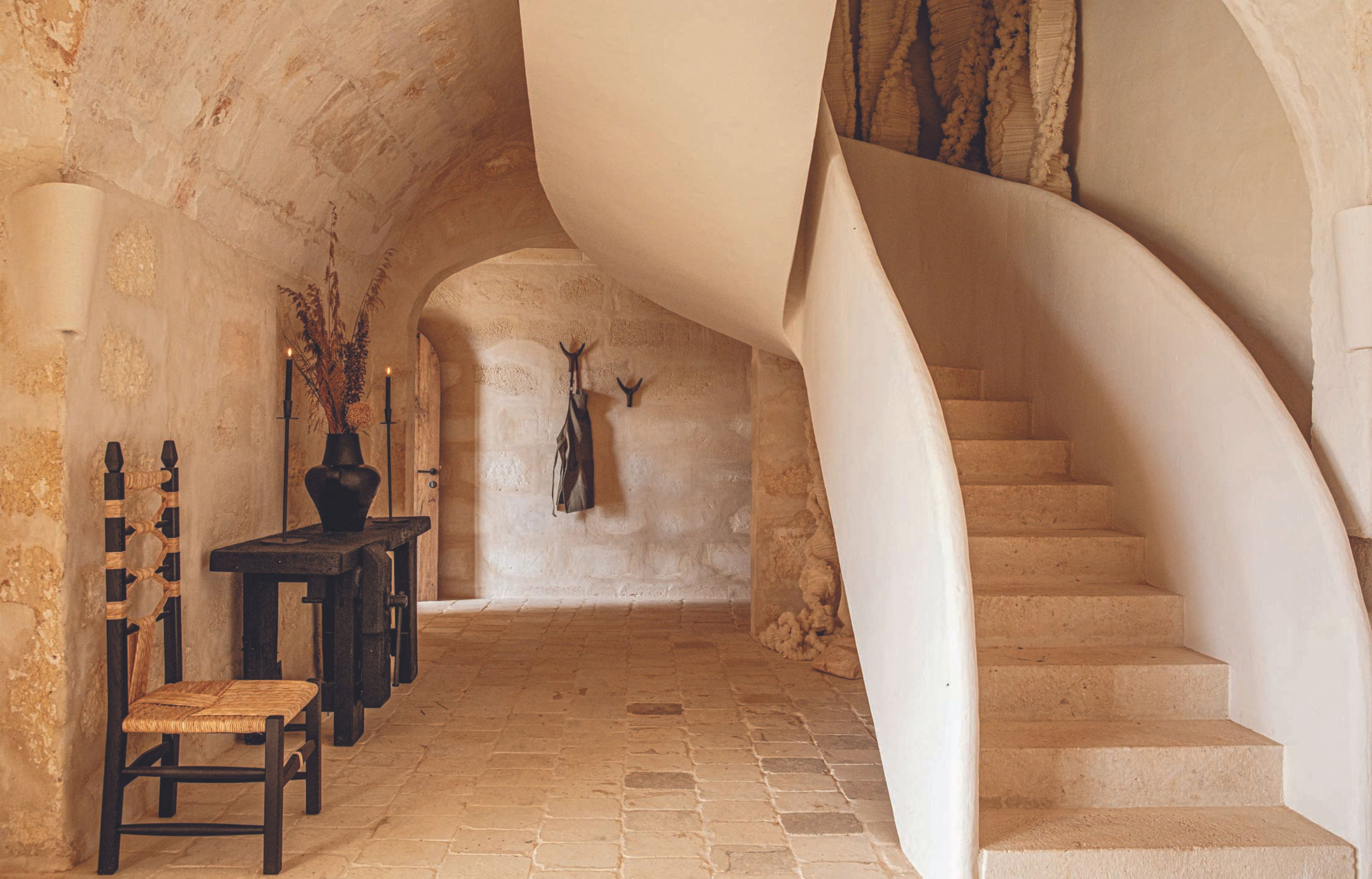 Des touches contemporaines sont apportées, à l’image de l’escalier principal qui dessert les chambres. Toute en pierre, sa rampe sinueuse est le fruit d’une collaboration entre les maçons minorquins et l’architecte.