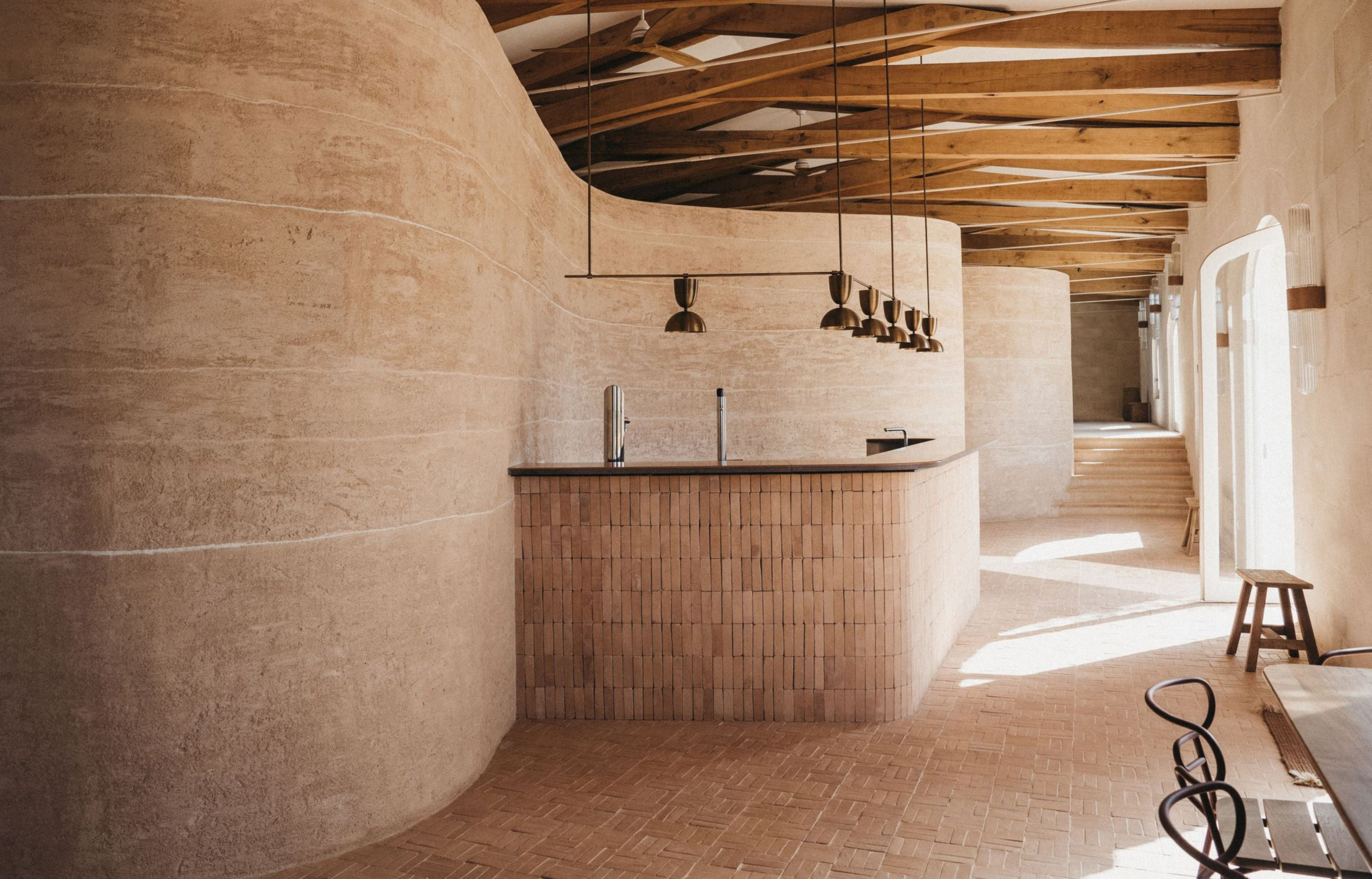 Dans le volume de la Boyera, pièce principale de 500 m2, les poutres s’entrelacent dans la nouvelle charpente, et un cloisonnement intérieur courbe en texture terreuse vient délimiter les espaces, tel un paravent qui occulte les zones techniques et sépare les différentes fonctions de la bâtisse.