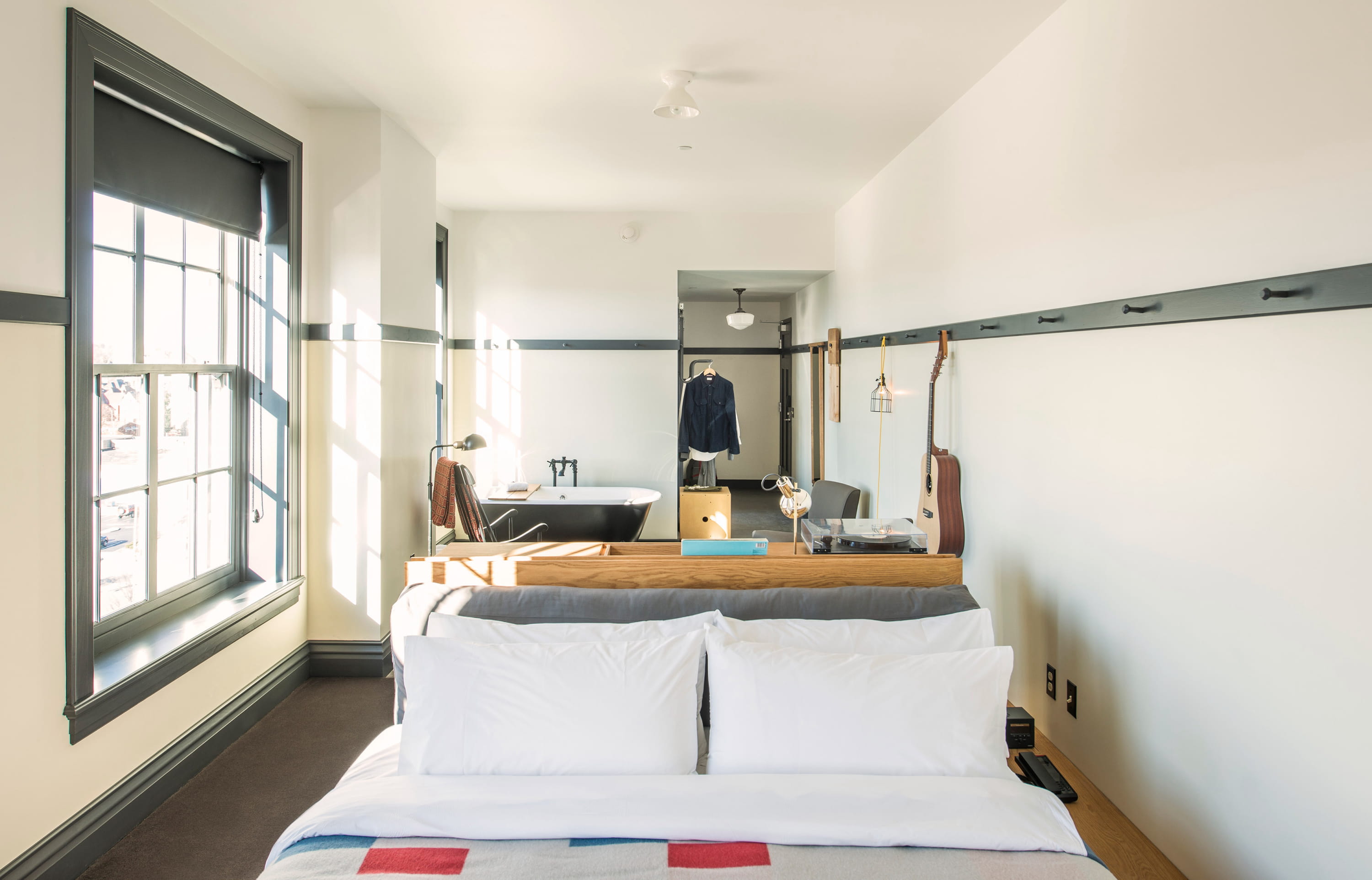 Après Shoreditch à Londres, Downton à L.A., les Ace Hotel ont inauguré leur neuvième établissement à Pittsburgh. Partageant le même passé industriel que Detroit, et son déclin, la ville a su se régénérer, jusqu’à obtenir en 2012 le titre de première ville américaine pour la qualité de vie. Un environnement plus que favorable pour les Ace Hotel qui ont choisi le quartier de East Liberty, en pleine hipsterisation, pour ouvrir leur tout dernier établissement. Installé dans une ancienne YMCA (les mouvements de jeunesses américains), le Ace de Pittsburgh est le premier à avoir été entièrement imaginé en interne. L’équipe d’Atelier Ace s’est appuyée sur les savoir-faire, la culture et les styles de Pennsylvanie pour l’ancrer dans une esthétique locale. Ils ont notamment collaboré avec Bones and All, un atelier d’ébénisterie du quartier, et le verrier Glenn Greene. Les immenses fenêtres ouvertes sur la ville qui baignent les chambres d’une lumière naturelle font prendre conscience de la qualité de l’air de cet ancien pilier industriel à la conscience écologique aiguë. Car l’hôtel s’inscrit dans l’écosystème de cette ville ponctuée de nombreux parcs et ambitionne d’accueillirburg voyageurs et voisins chez Whitfield, la néo-taverne minimaliste adepte du locavorisme…