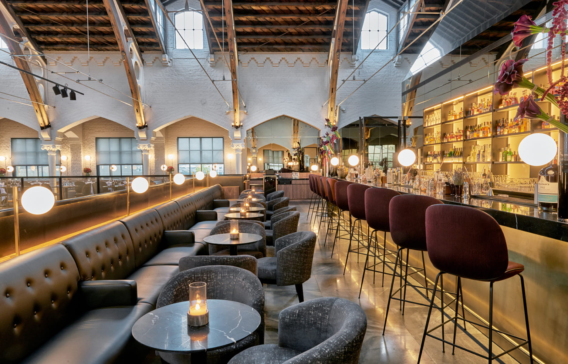Le quartier de King’s Cross étant en pleine transformation, les nouvelles adresses y fleurissent. C’est ainsi que le restaurant German Gymnasium a posé ses casseroles dans un bâtiment en brique qui accueillait, en 1864, la Société des gymnastes allemands. Les architectes Allies and Morrison ont conservé l’anatomie des lieux tout en créant un système de mezzanine. Si les anneaux des gymnastes ont été conservés, pas besoin d’être Nadia Comaneci pour s’attabler autour des plats d’inspiration germanique ! Conran + Partners a signé l’intérieur, qui vient se réchauffer de tons roses et rouges contemporains.