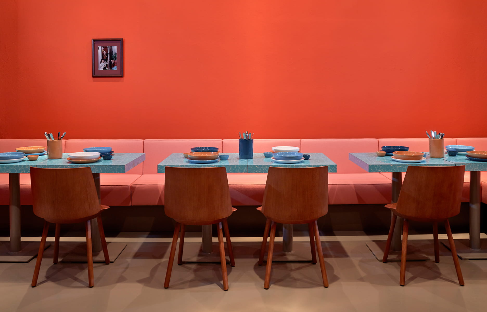 Un vent californien souffle sur le quartier branché de Kreuzberg. Louis Pretty interprète les lignes et les couleurs du modernisme de Palm Springs et du tableau A Bigger Splash, de David Hockney. Entre murs rosés et orangés et banquettes saumon, les tables bleu piscine inviteraient presque à un plongeon… Elles s’entourent d’une édition spéciale des chaises Houdini du designer Stefan Diez (E15). Cette décoration lumineuse est signée Philipp Mainzer Office for Architecture and Design, à qui l’on doit des boutiques Aesop et Closed ainsi que la distillerie de la marque de gin Monkey 47. Chez Louis Pretty, le pastrami et les plats casher prennent un sacré coup de soleil.