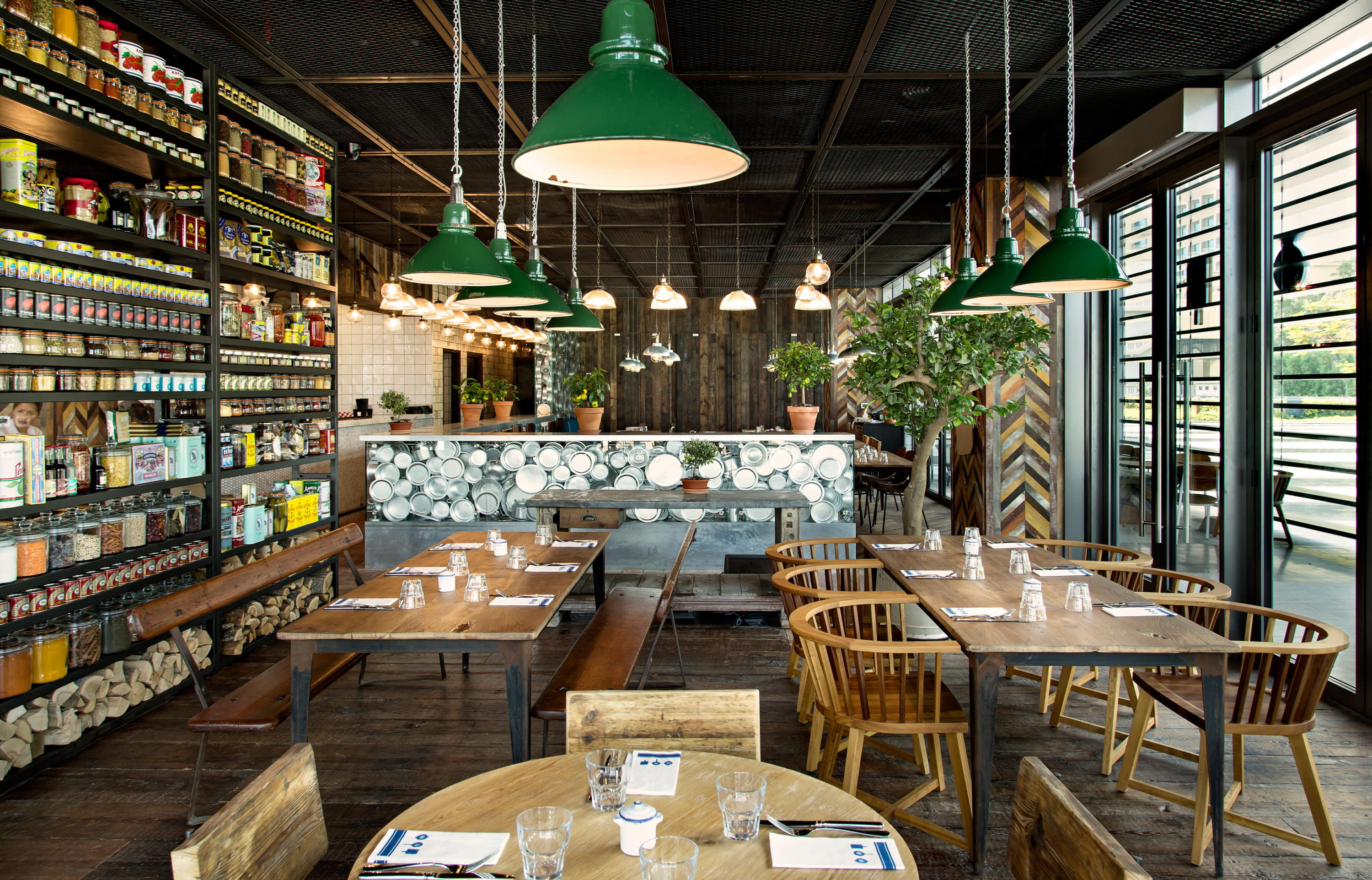 Pour ce sixième restaurant signé avec le chef star Tom Aikens, le studio d’architecture londonien Michaelis Boyd a imaginé la chaleur d’une cuisine familiale rustique. Autour des tables et des chaises dépareillées, des étagères pleines de bocaux répondent à un comptoir-vitrine enfermant un mur de casseroles. Vieille balance, pichets usés, ustensiles de cuisine en tout genre, tous ces objets, chinés au Sunbury Antiques Market à Kempton Race Course (Angleterre), recomposent un certain passé. Il y flotte d’ailleurs une douce ambiance d’épicerie de campagne d’hier. Dans ce lieu chaleureux et rassurant, la carte invite à partager les plats servis directement dans les casseroles.