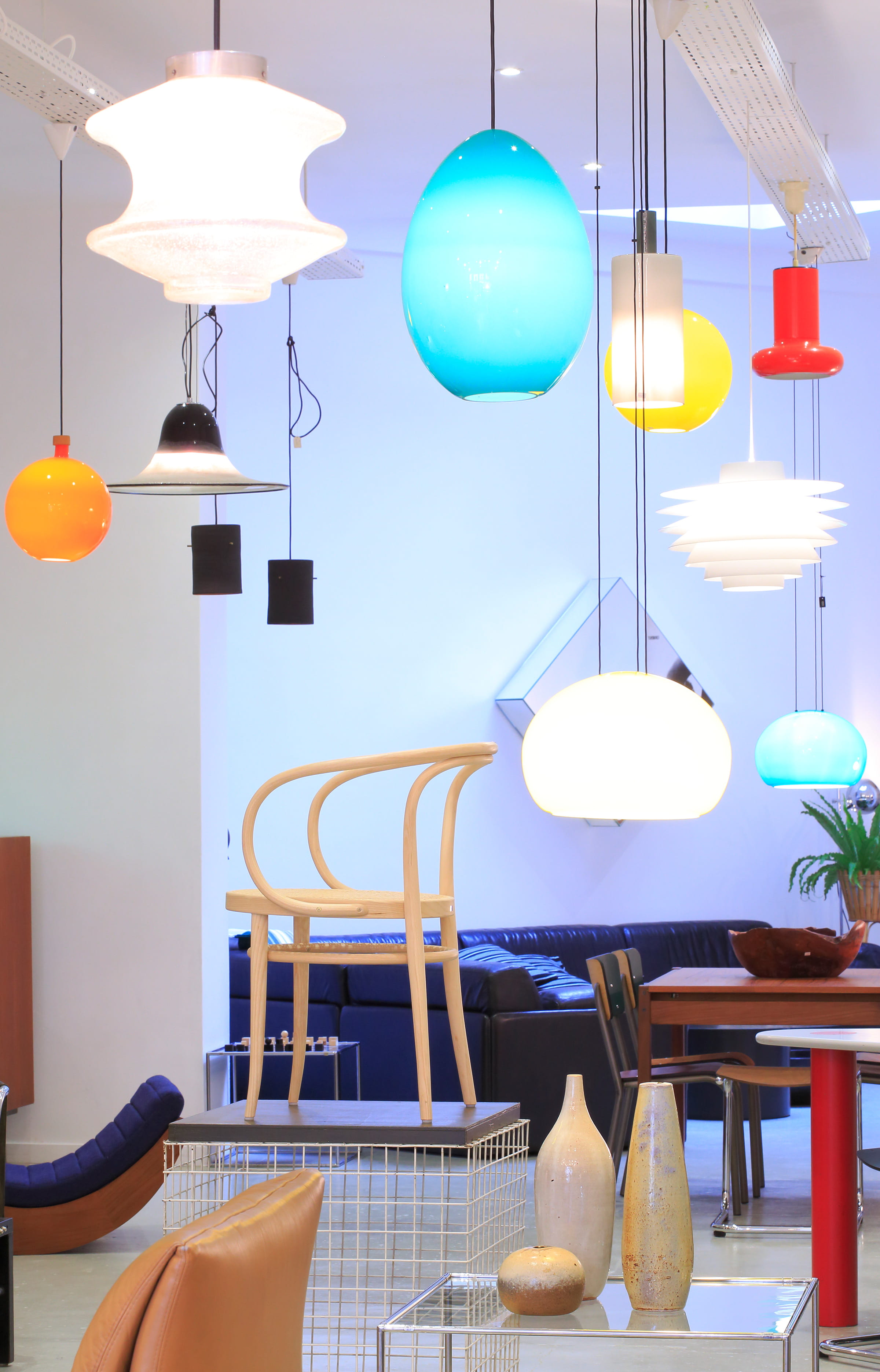 Frank Pay, un fou de géométrie et de matériaux nobles, s’est offert cet automne un lieu où mettre en scène son univers design : Semi de Torsten Thorup et autres lampes de verre multicolores des années 70 made in Sweden ou Denmark ; un amas de chaises savamment disposées et un bureau signé Ate Van Apeldoorn et de nouveautés de la marque madrilène Sol & Luna.