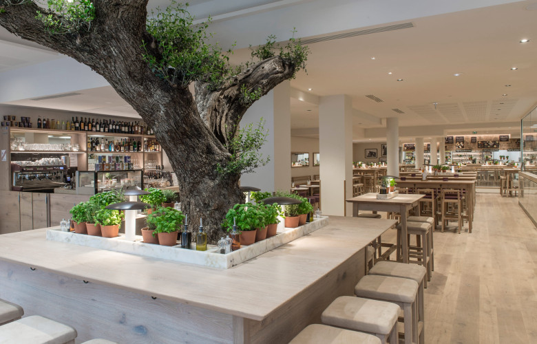 Quinze ans après sa création, Vapiano arrive enfin à Paris dans un espace de quelque 1 200 m2. Comme à son habitude, la chaîne de restauration italienne – d’origine allemande – mise sur la fraîcheur et la naturalité de son offre culinaire comme de son agencement. Conçu par le designer milanais Matteo Thun, le concept de Vapiano a dès le début misé sur un style à l’opposé de celui des cafétérias et des fast-foods d’alors : mobilier massif en bois clair, sellerie en cuir naturel, minipotagers aromatiques sur les tables, mais aussi points de verdure dans l’espace, comme en témoignent, rue Marbeuf, un impressionnant mur végétal et un olivier centenaire. Dans l’assiette, pizzas, pastas et salades, cuisinées à la minute avec des produits de qualité pour un budget « Ticket-Restaurant ». Forcément, les pizzerias et trattorias branchées de la capitale n’ont qu’à bien se tenir.