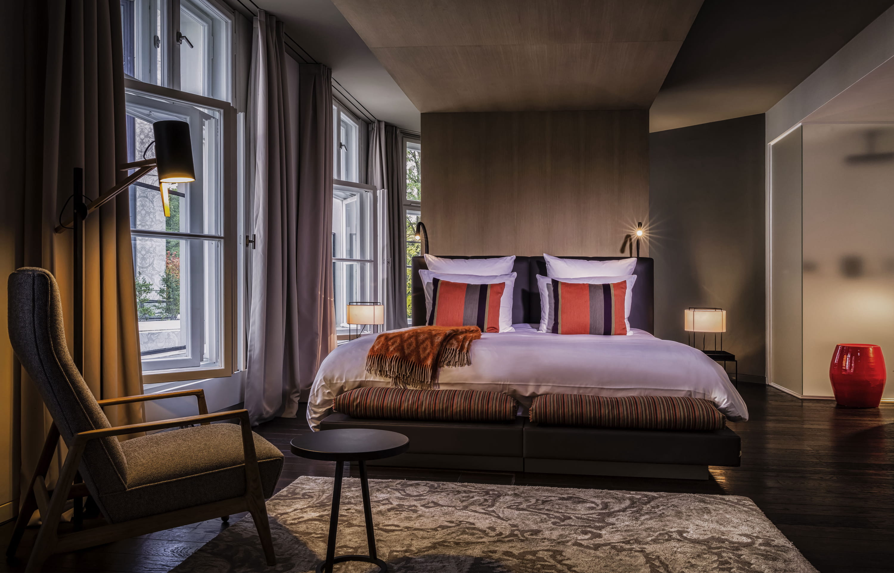 Luxueuse oasis entre le zoo de Berlin et le parc de Tiergarten, Das Stue (en couverture) est passé l’an dernier dans le giron du groupe Accor. L’occasion de revenir sur cette adresse prisée des créatifs, qui a déjà fait beaucoup parler d’elle. Et il y a de quoi ! Construit dans les années 30 par le même architecte que celui du grand magasin berlinois KaDeWe, le bâtiment accueillit un temps l’ambassade royale du Danemark avant d’être converti en hôtel. Mis en valeur par un lustre monumental, le double escalier n’a rien perdu de sa théâtralité. C’est Patricia Urquiola qui a signé l’aménagement de ses parties communes, mélangeant du mobilier et des luminaires de Molteni, B&B Italia, Moroso et Flos. Quant aux 78 chambres, réparties entre les vieux murs et une nouvelle annexe, leur ambiance élégante et moderne porte l’empreinte de l’agence LVG Arquitectura.