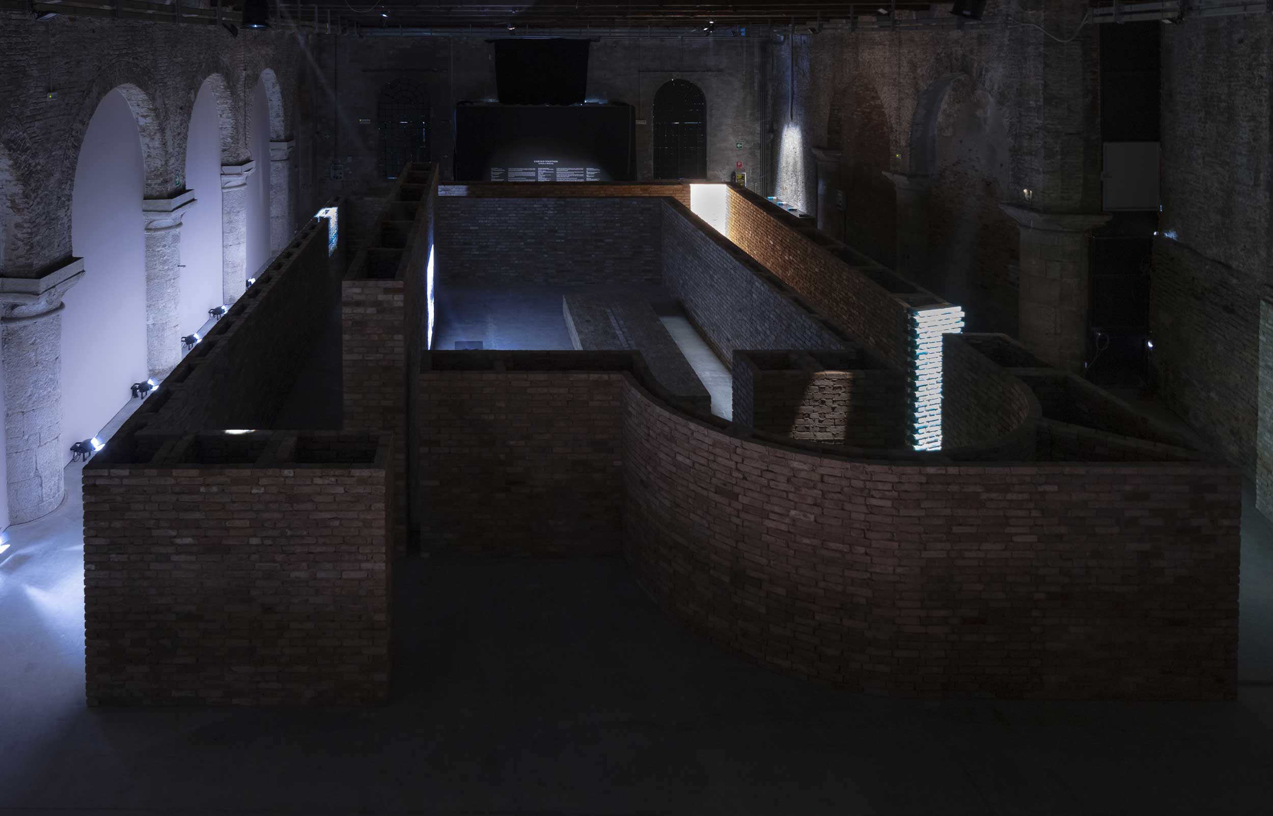 Plongés dans la pénombre, les visiteurs empruntent un labyrinthe énigmatique, fait de briques vénitiennes issues du réemploi et des briques vernissées fabriquées avec les étudiants en Ouzbékistan. Elles s’entremêlent harmonieusement dans une écriture architecturale et une mise en œuvre artisanale, tutoyant volontairement l’inachevé.