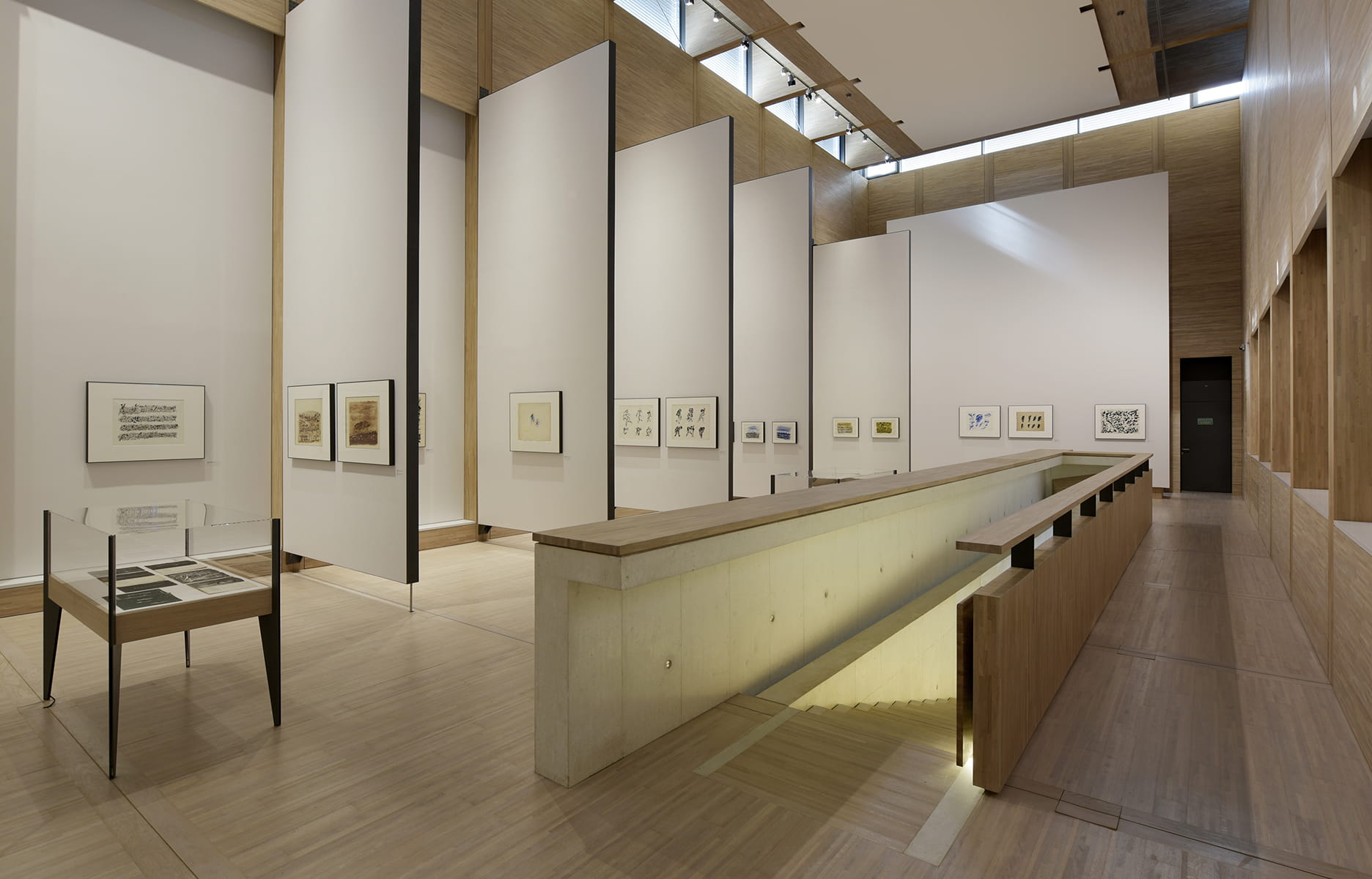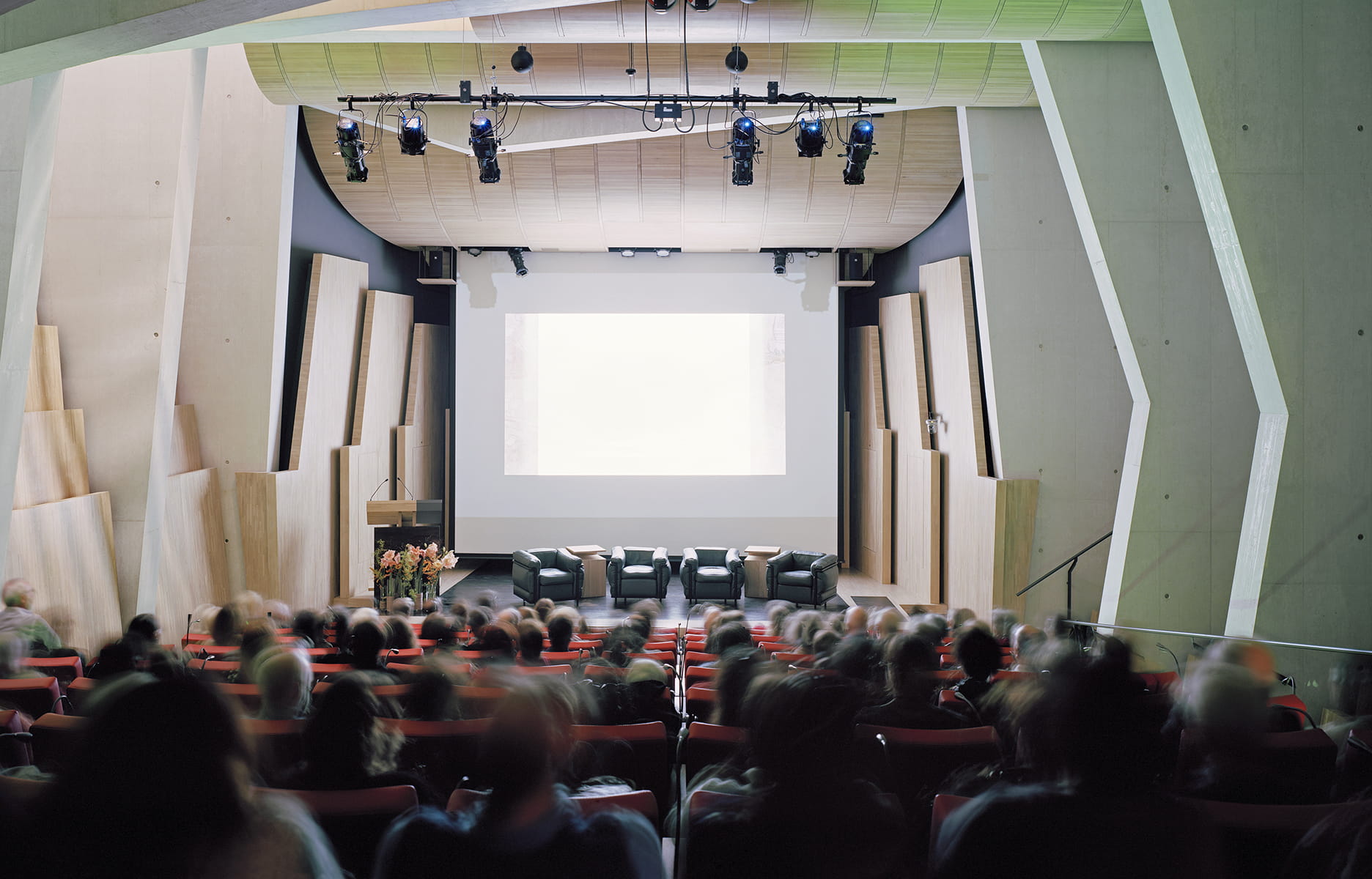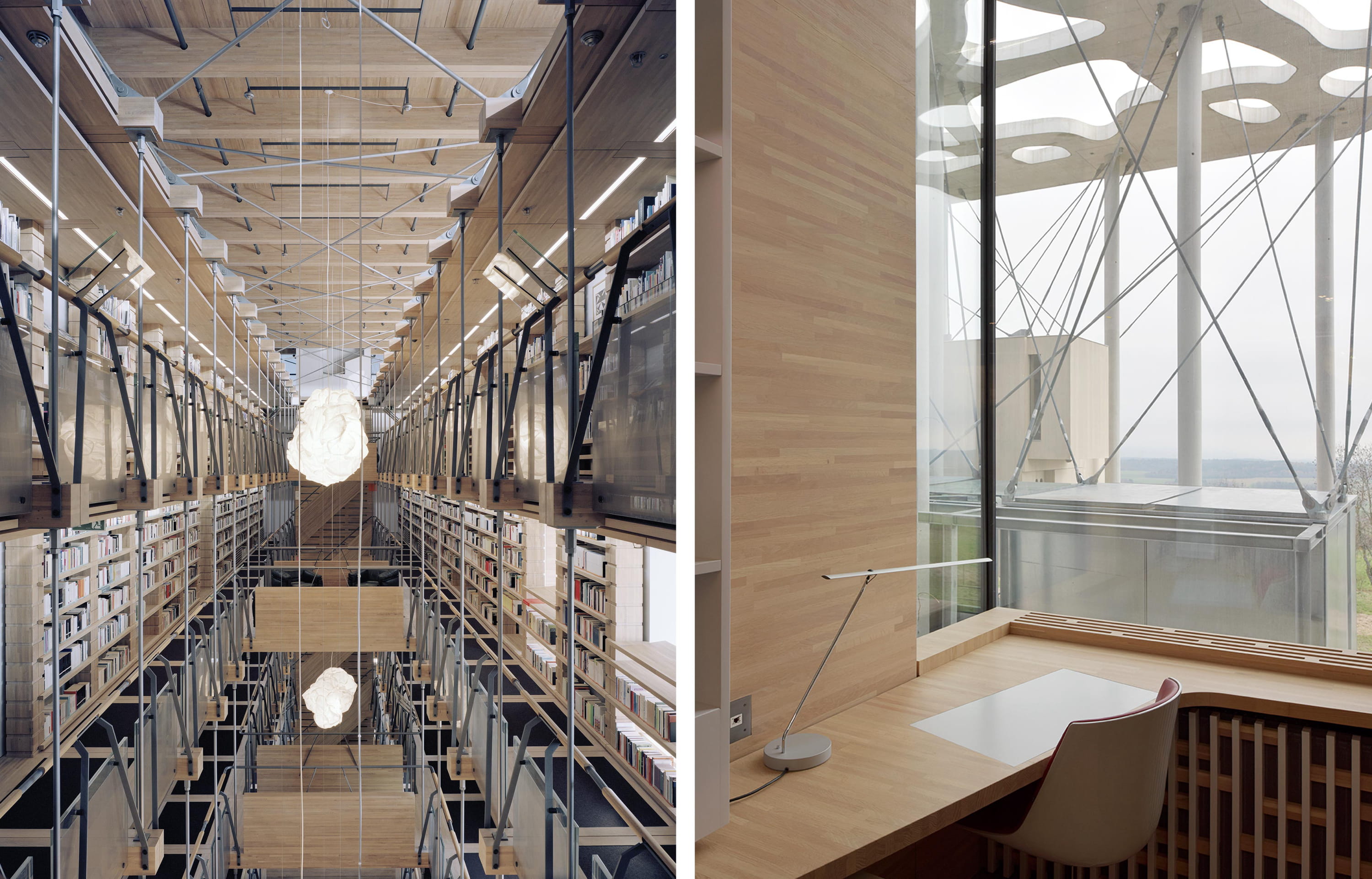 Conçu en fer à cheval, l’intérieur fait voyager à travers 80 000 ouvrages de littérature contemporaine en 12 langues, parmi lesquels on trouve des raretés. Mangeat et Wahlen ont aussi réalisé les niveaux inférieurs de la fondation, profondément enfouis et bien plus vastes que la surface visible. Là se situent les archives de la bibliothèque, mais aussi l’auditorium de 100 places (avec loges d’artistes), à l’acoustique impeccable, qui se transforme à l’occasion en salle de théâtre. Au-dessus, des lectures à voix haute ont lieu autour d’une vraie cheminée et ce foyer mue parfois en galerie où s’exposent les collages de Jacques Prévert, la musique de Boris Vian ou, actuellement, l’œuvre de l’artiste Anselm Kiefer (jusqu’au 12 mai).