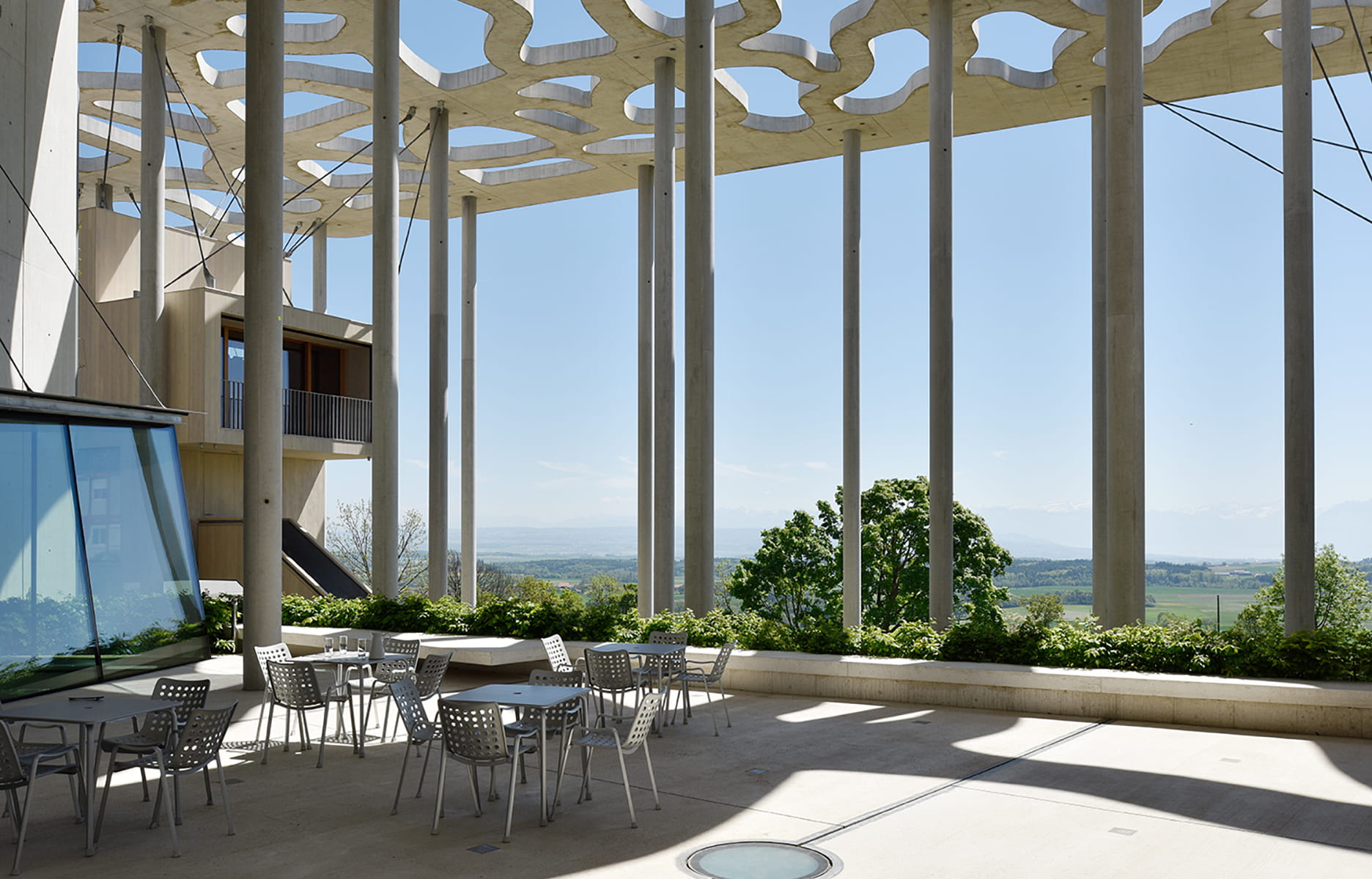 La découverte de la Fondation Jan Michalski provoque le trouble. Le canton de Vaud est en effet agricole, accoutumé aux fermes trapues solidement enracinées dans la terre. Or, près de Montricher s’élève au loin, comme une apparition, une rébellion architecturale : un plafond-parapluie troué comme un emmental flotte en plein champ, piqué sur ce qui semble être des cure-dents géants. Métaphore des forêts environnantes, cette canopée minérale fait face au mont Blanc auréolé de neige. Inspirant pour qui a le goût de l’écrit, ce paysage joue en effet un rôle fondamental lors des retraites proposées par la fondation aux écrivains, traducteurs et artistes du monde entier, ayant un lien avec la littérature.