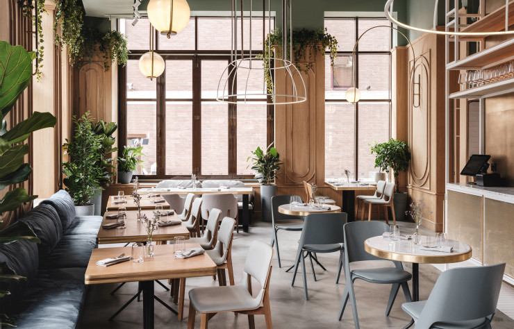Pour ce restaurant à Moscou, les designers du studio new-yorkais Asthetíque (également implanté en Russie) expliquent s’être inspirés des décors stylisés des films de Wes Anderson. On cherche donc entre les arches, la forêt de laiton doré, les sièges bleu glacier et le comptoir take away de cette grande salle à manger en rez-de-chaussée – ainsi que dans les autres espaces plus cossus qui se trouvent à l’étage –, les indices de cette identité théâtrale censée plaire à des clientèles très variées, au gré des jours et des heures.