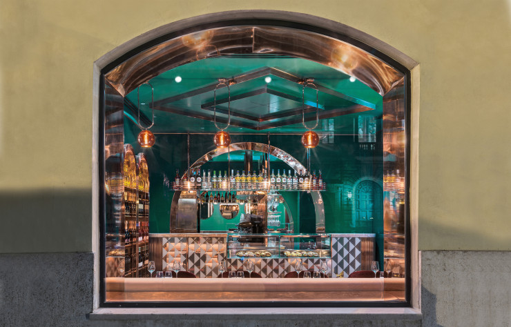 La chaîne italienne de cafétérias en gare a un appétit d’ogre. La voilà qui met le couvert pour de vrai à Covent Garden, à Londres, et à Rome, entre le palais Farnese (où loge l’ambassade de France) et le remuant Campo de’ Fiori. À la place du vieux Caffè Farnese, le studio de Daniela Colli inscrit ce nouveau VyTA (café, restaurant et cocktail-bar) dans une extravagance à la fois bourgeoise et accrocheuse : marbres polychromes, cuivre brillant et surfaces laquées, miroirs et velours, symétries et formes audacieuses épousent une palette de vert émeraude et de rose pastel. La Renaissance, oui, mais contemporaine…