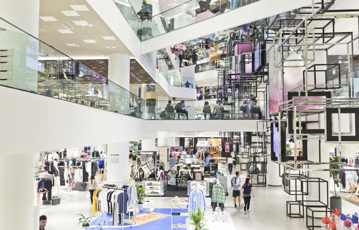 L’offre de shopping malls est certes pléthorique à Bangkok, mais Siam Discovery, entièrement repensé par le studio japonais Nendo, impose sa différence. La blancheur poétique et les jeux graphiques de lignes, si caractéristiques du travail du designer star tokyoïte, en font une vraie bulle d’oxygène dans ce quartier parmi les plus trépidants et consuméristes de la capitale. Résultat : la sélection pointue de marques de mode, de beauté ou de design – dont Thingg, le label du jeune duo de Thinkk Studio – y nage comme un poisson dans l’eau.