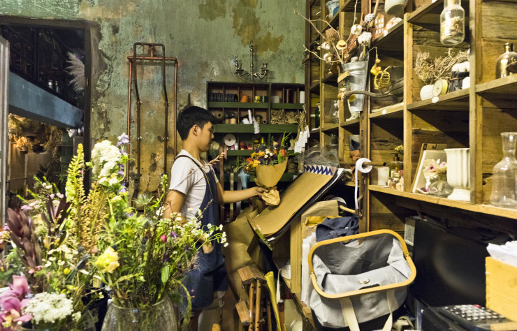 Jeune architecte, Nattaphat Suriyakumpho imagine des compositions florales que l’on s’arrache. Sa micro-boutique de Chinatown – et, à l’étage, l’espace café et l’échoppe vintage auxquels on accède par un escalier qui ravirait Tim Burton – cultive avec un raffinement authentique le mystère qui émane habituellement des cabinets de curiosités.