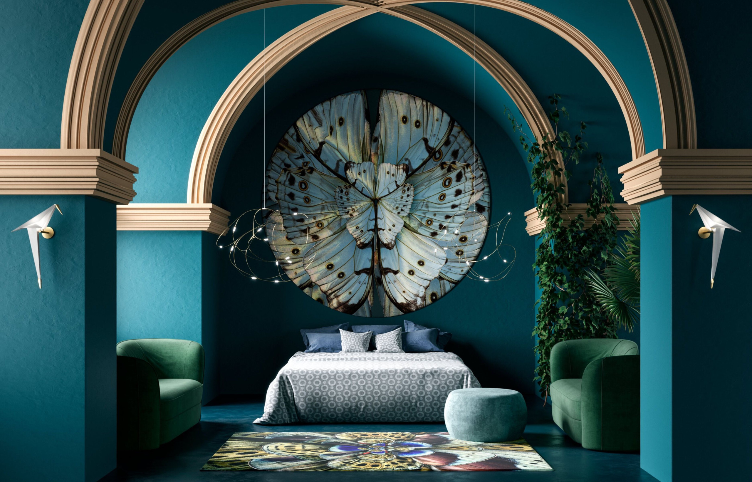 Au mur, tapis Mimesis Hibiscus Trinium, collection « Mimesis », signée Seb Janiak, 2 modèles, 6 coloris, en Nylon, Ø 250 cm (Moooi).