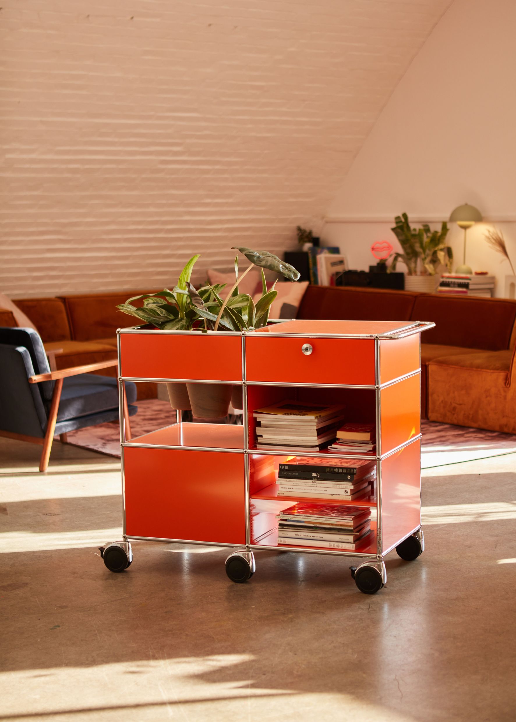 Lancée en 1969, la production en série du système USM Haller propage une esthétique demeurée inchangée depuis. Cette dernière repose sur l’assemblage de trois éléments phares : des tubes en acier chromé reliés entre eux par une ingénieuse boule de connexion, le tout habillé de panneaux de tôle laquée.