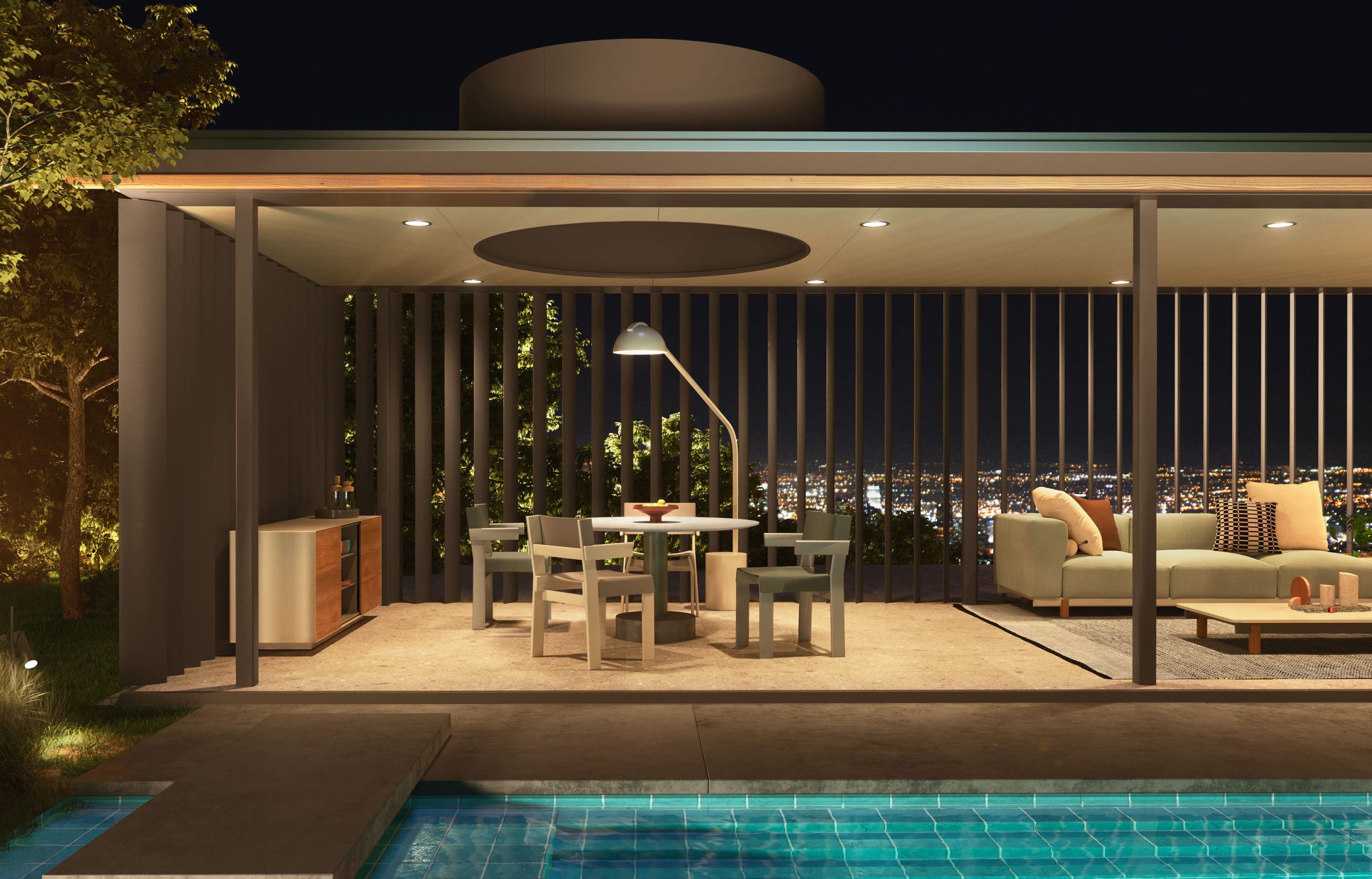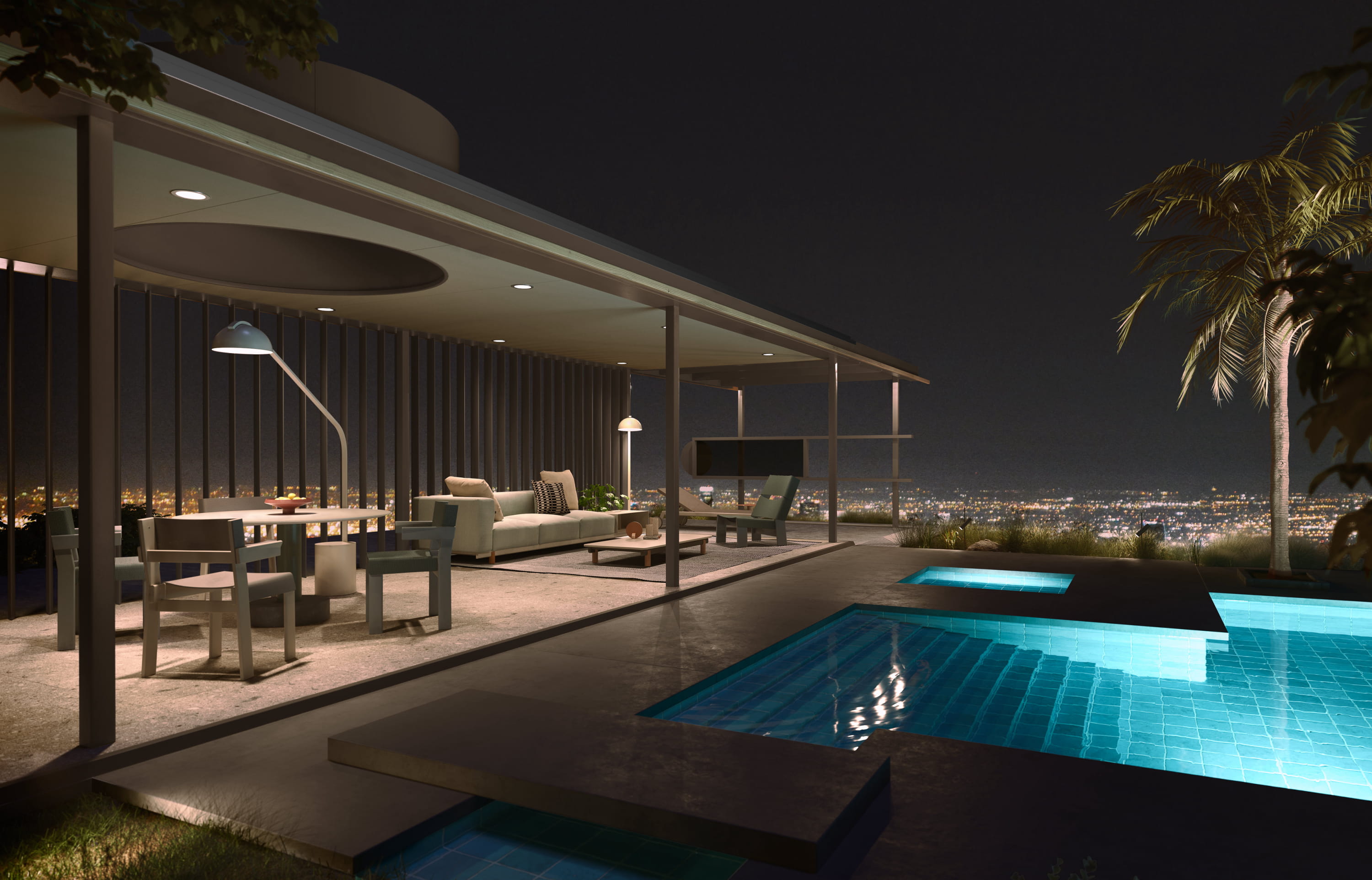 Pour le reste, Kettal s’est employé à reproduire fidèlement l’architecture du penthouse original. Mêmes poutres de 10 cm pour alléger la silhouette, même caillebottis pour prolonger l’espace à vivre à l’extérieur… Le chef-d’œuvre de Neutra a été respecté jusqu’au petit bassin dans lequel se mire le paysage environnant…